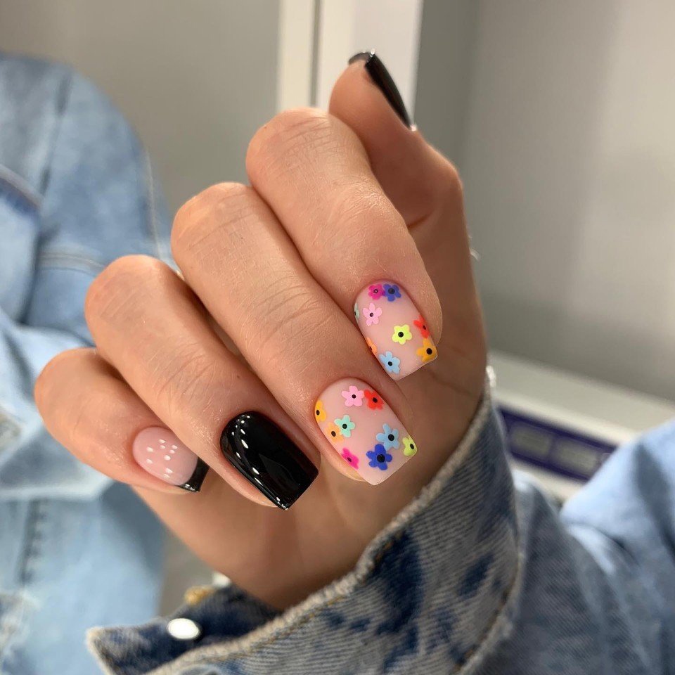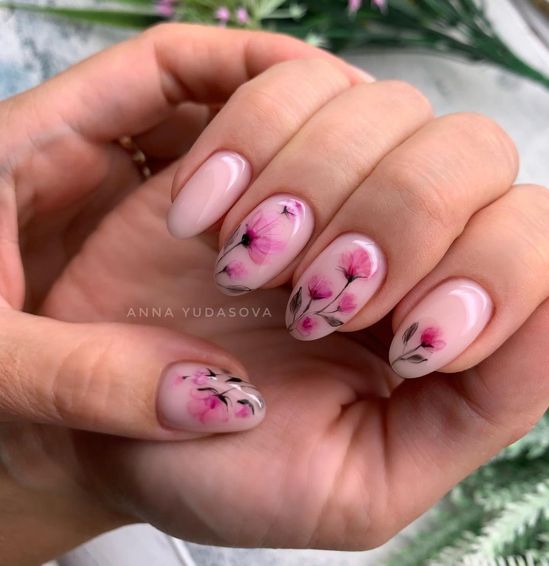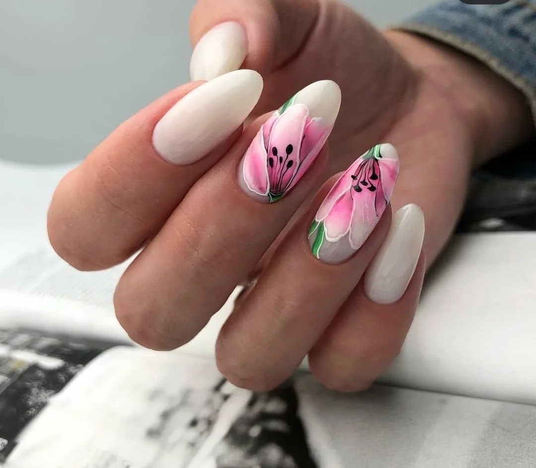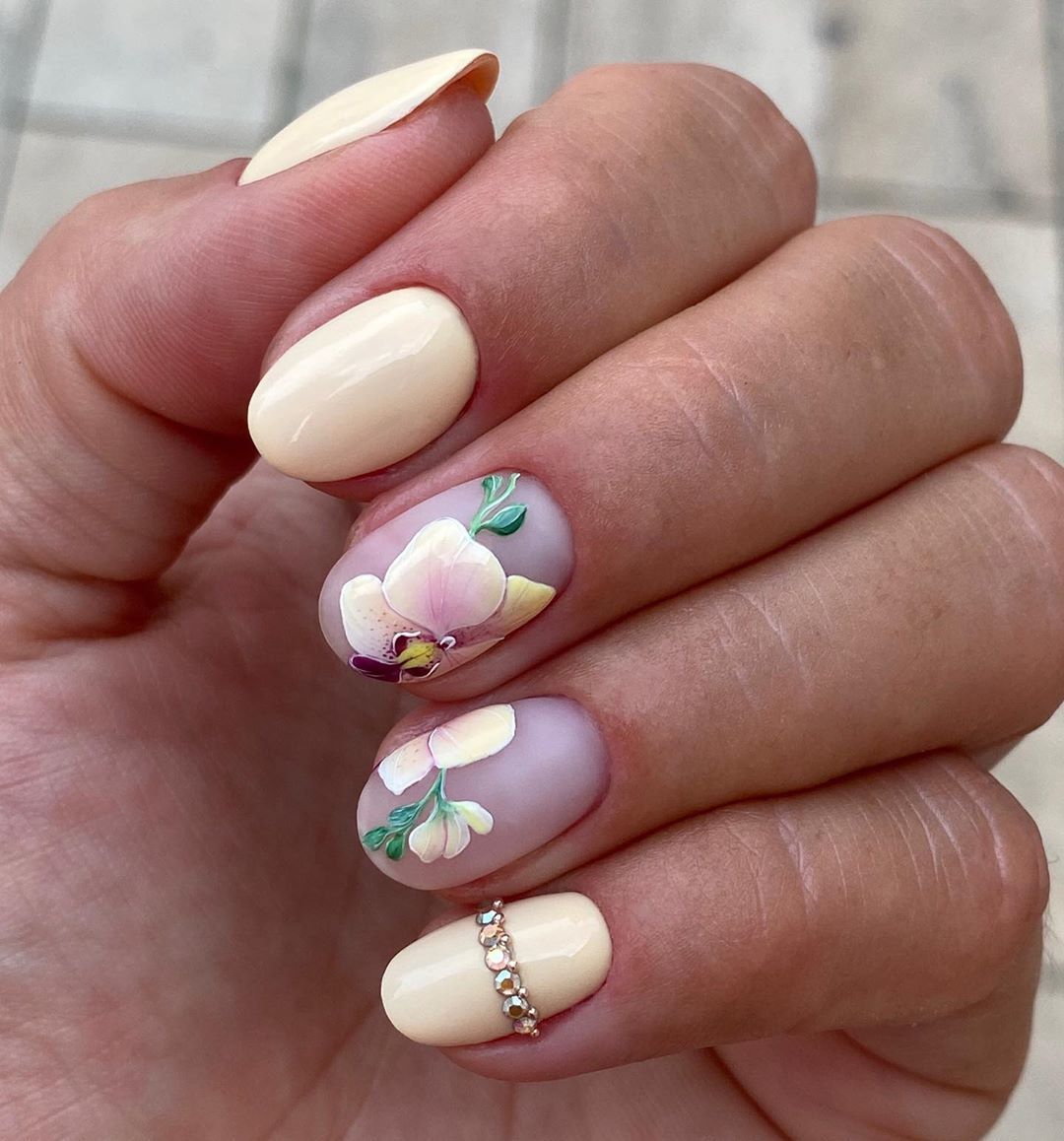Цветы и другая флористика — самый актуальный вариант для маникюра в мае. Вы можете отдать предпочтение скромным минималистичным рисунками или сделать дизайн «под обои», когда на ноготки наносят богатый густой рисунок цветов с симметричным исполнением. Такой дизайн лучше всего смотрится на матовой темной основе.