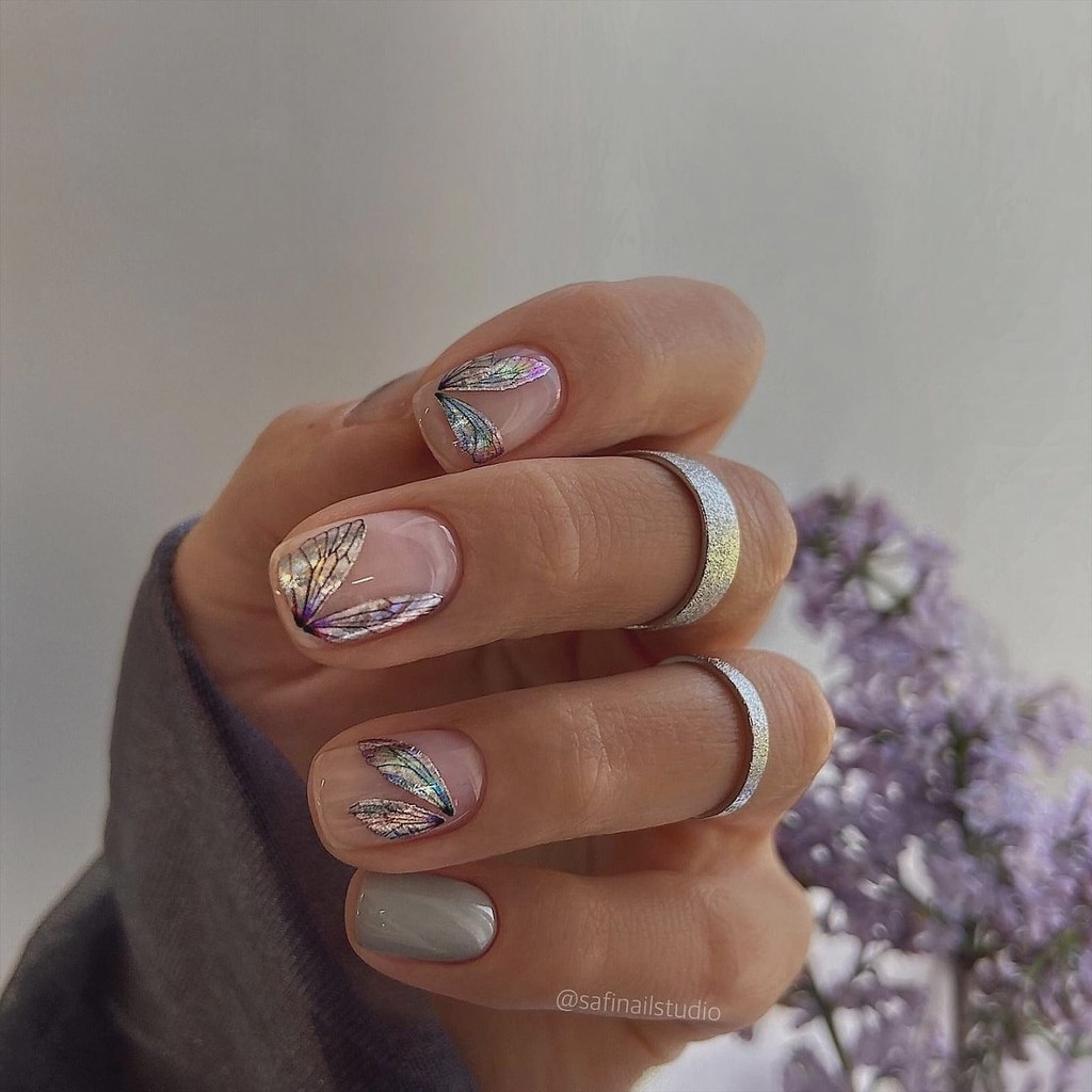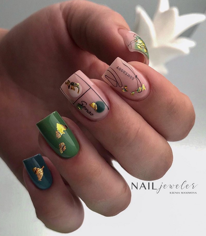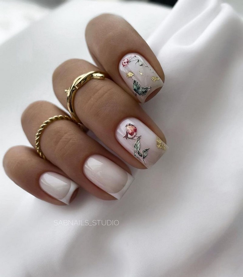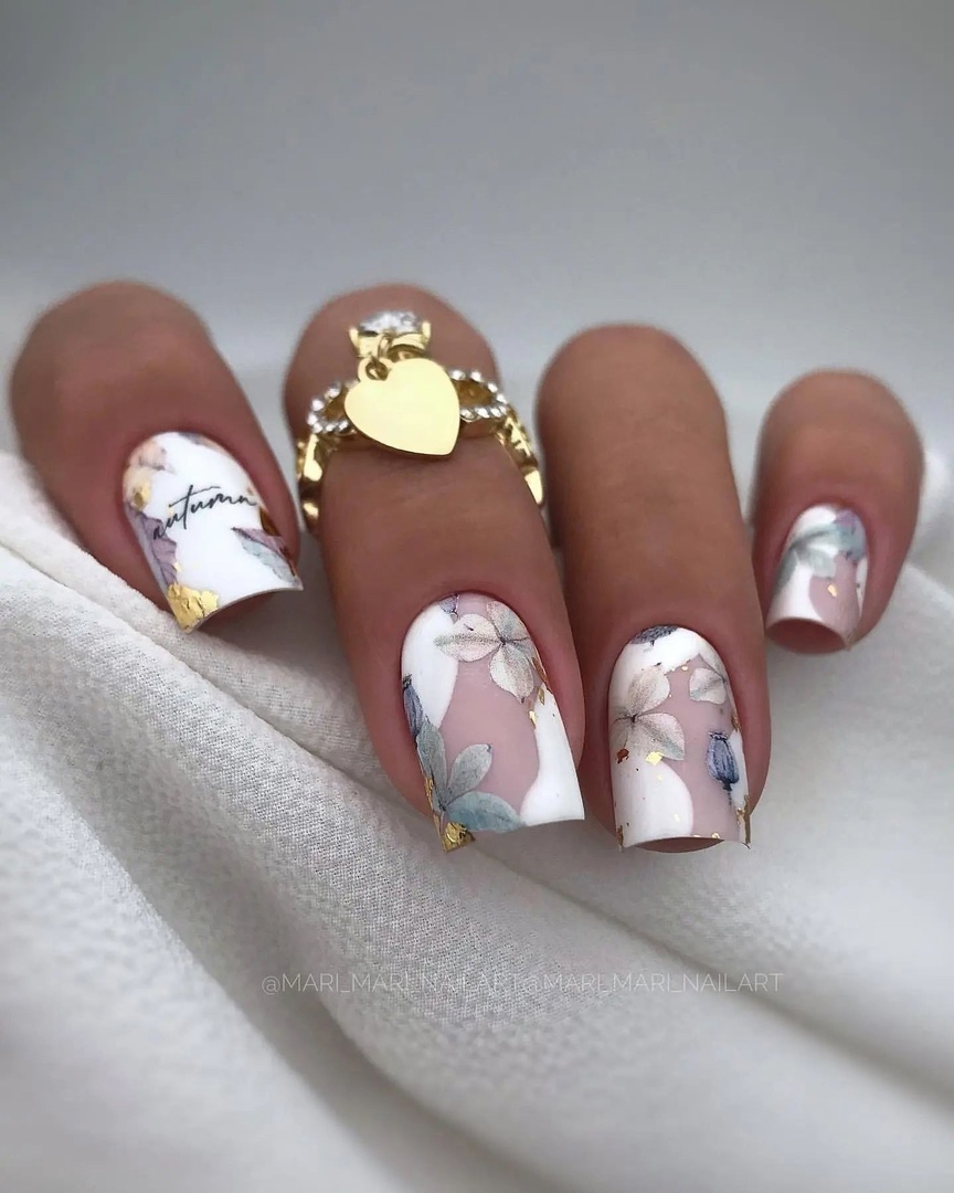 Тематика маникюра может быть самой разной — в тренде майские нежные цветы с фольгированными акцентами, изображения насекомых, птиц и ягод.