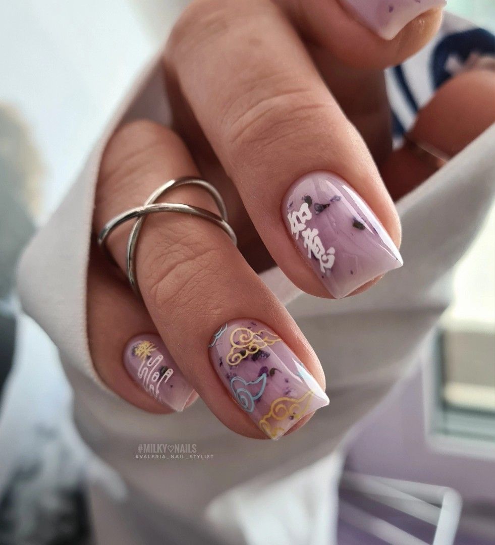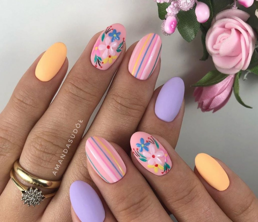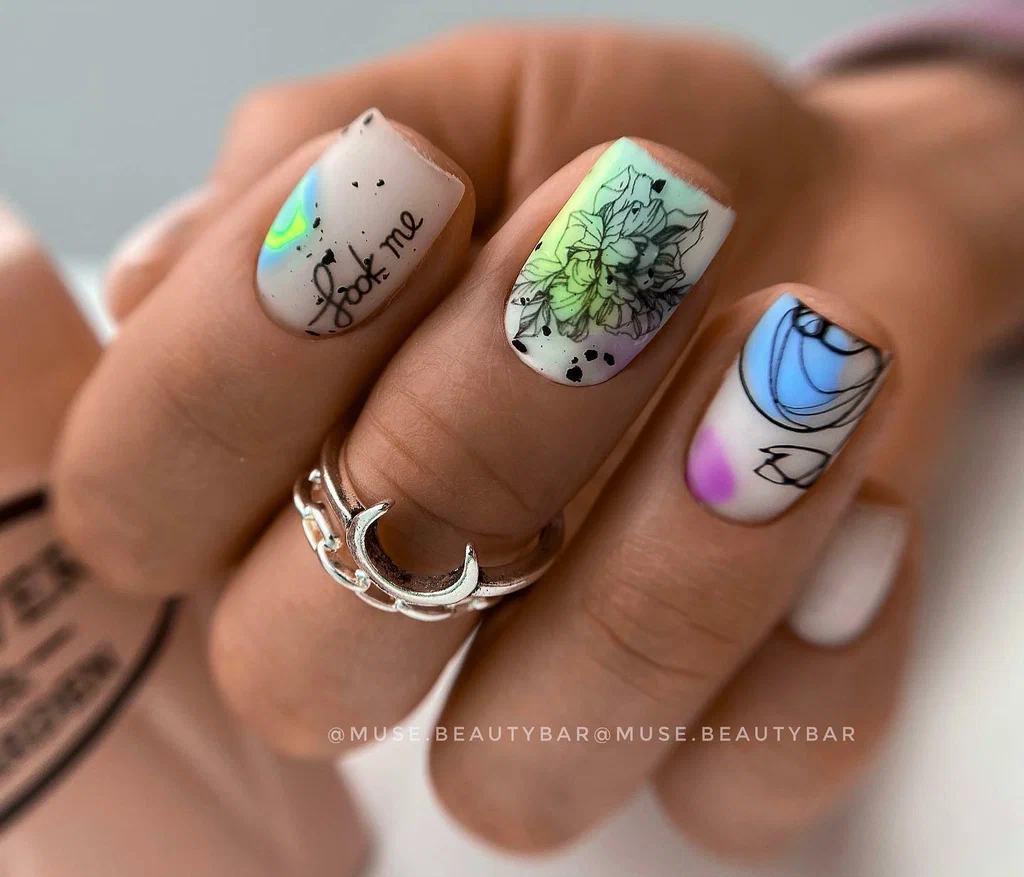 Тематика маникюра может быть самой разной — в тренде майские нежные цветы с фольгированными акцентами, изображения насекомых, птиц и ягод.