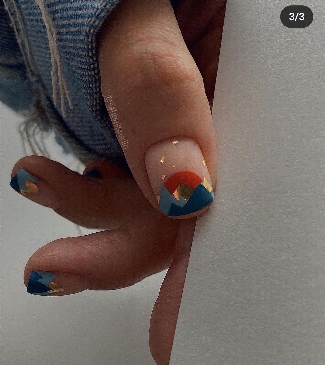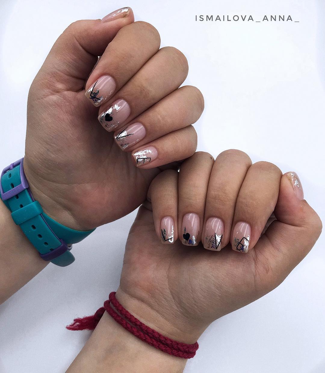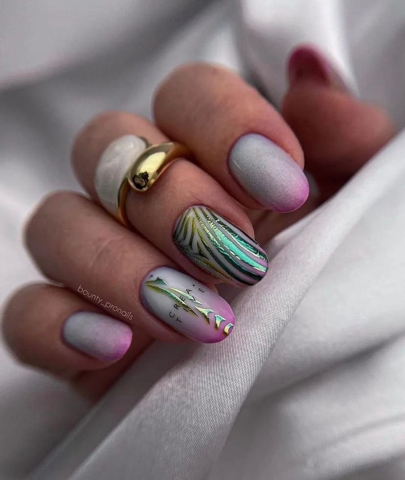 Украсить майский маникюр фольгой вы можете как самостоятельно. так и в салоне. Это очень удобный инструмент для создания стильного дизайна, ведь никаких правил нет — чем необычнее будет нанесена фольга, тем интереснее маникюр. Обратите внимание на листовой материал, который наносят тонкой кистью или фольгированные полоски, с помощью которых можно создать геометрический рисунок. На ярком майском солнце такой маникюр будет блестеть и точно не останется незамеченным.