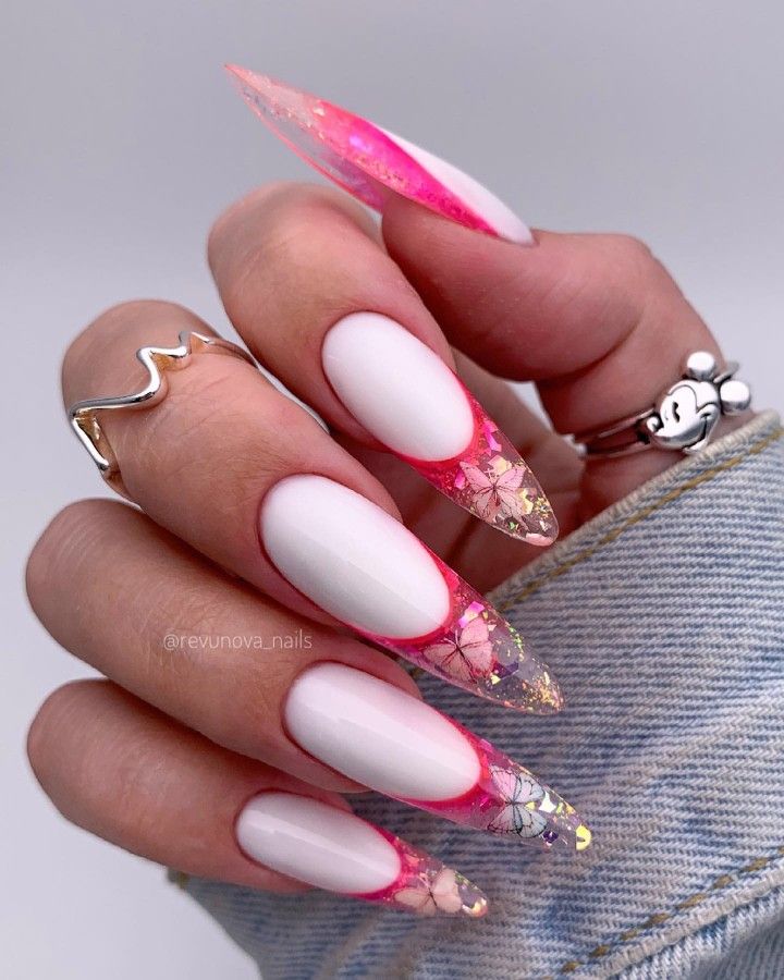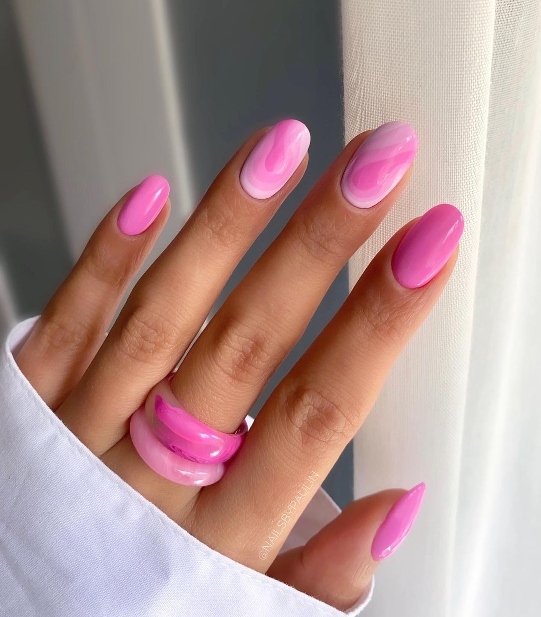 Нежный маникюр в мае обязательно должен быть розовым. Можно обратить внимание на оттенок фуксии или вива маджента. Но самым актуальным будет нежный оттенок pink в пастельном варианте. На такой базе отлично смотрится контрастный рисунок цветов или бабочек.