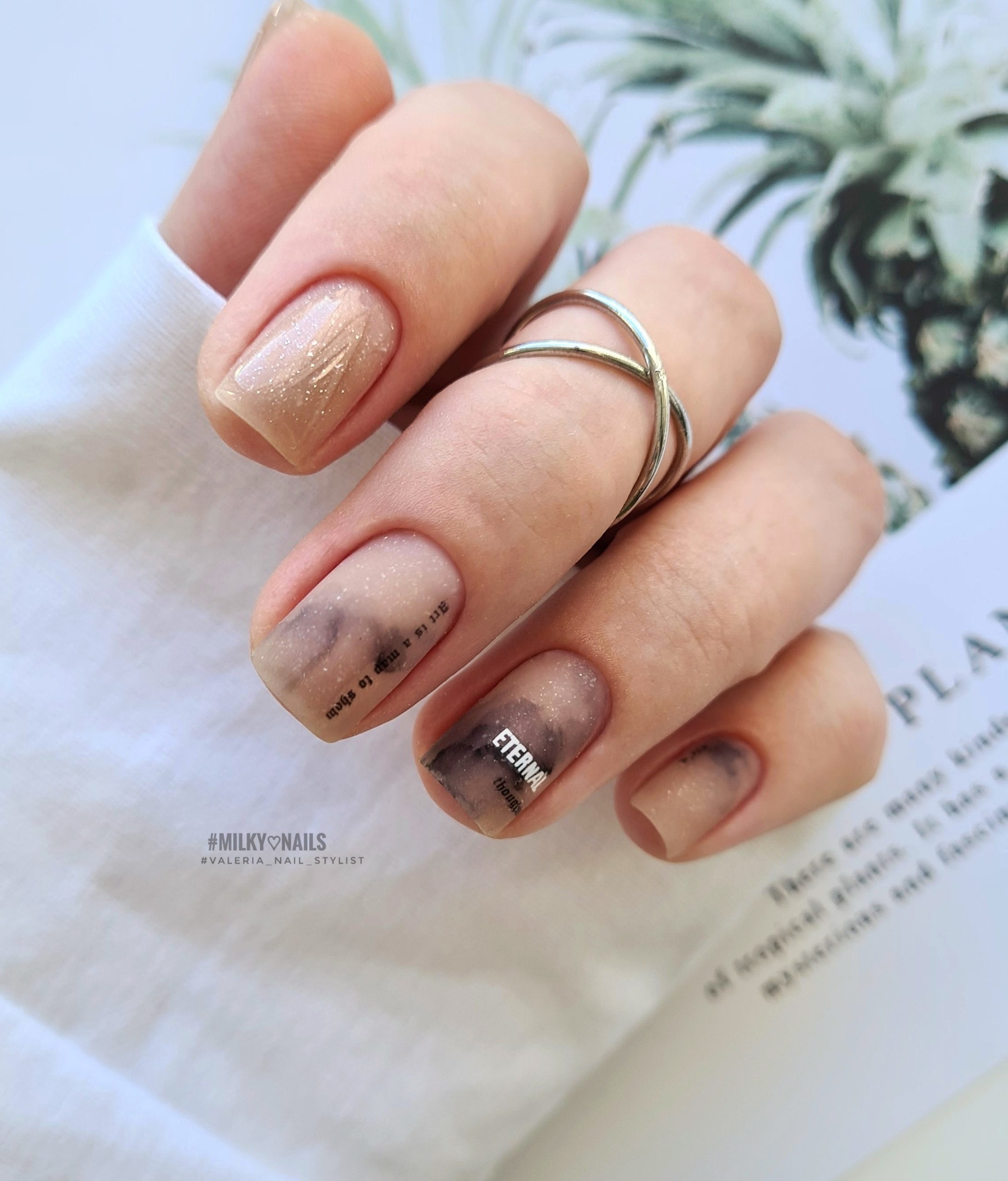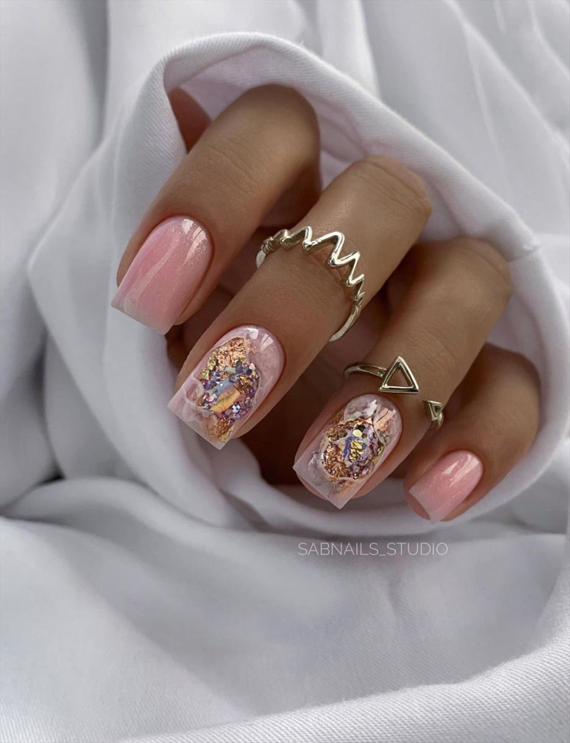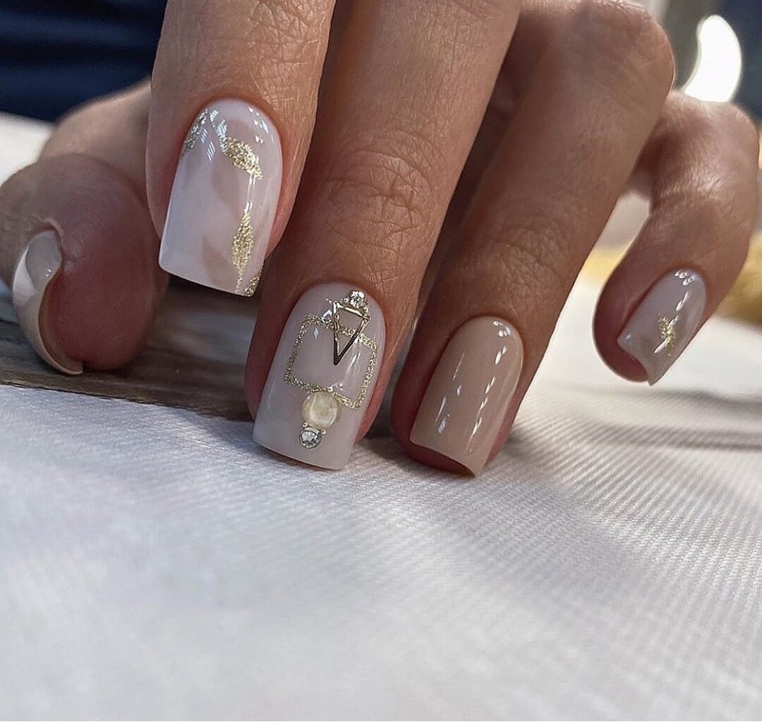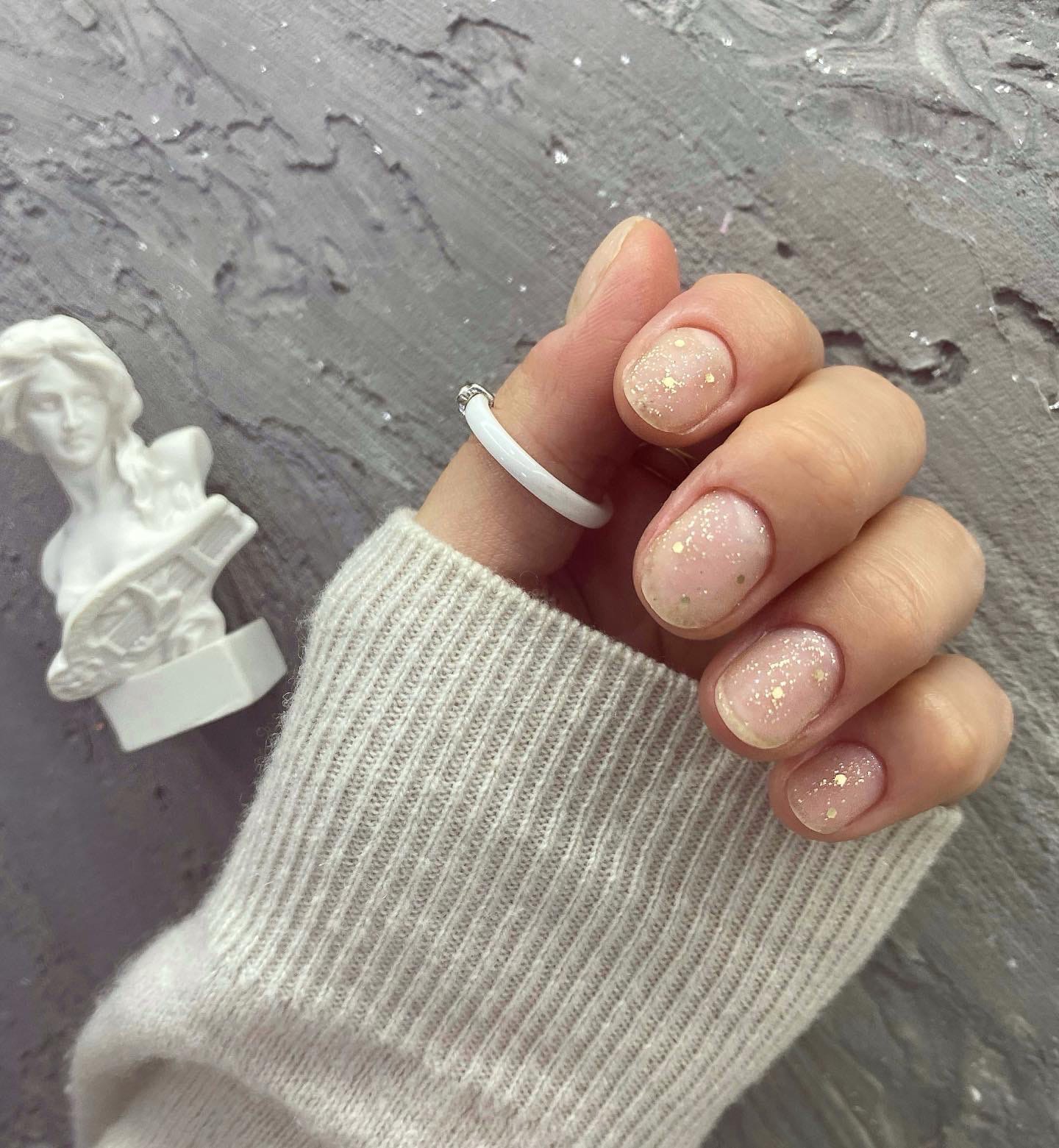 Нюдовый маникюр — лучшее решение для праздничных дней и отдыха. Можно отдать предпочтение базовому однотонному дизайну или добавить немного блеска — глиттера, мелких страз или бульонок.