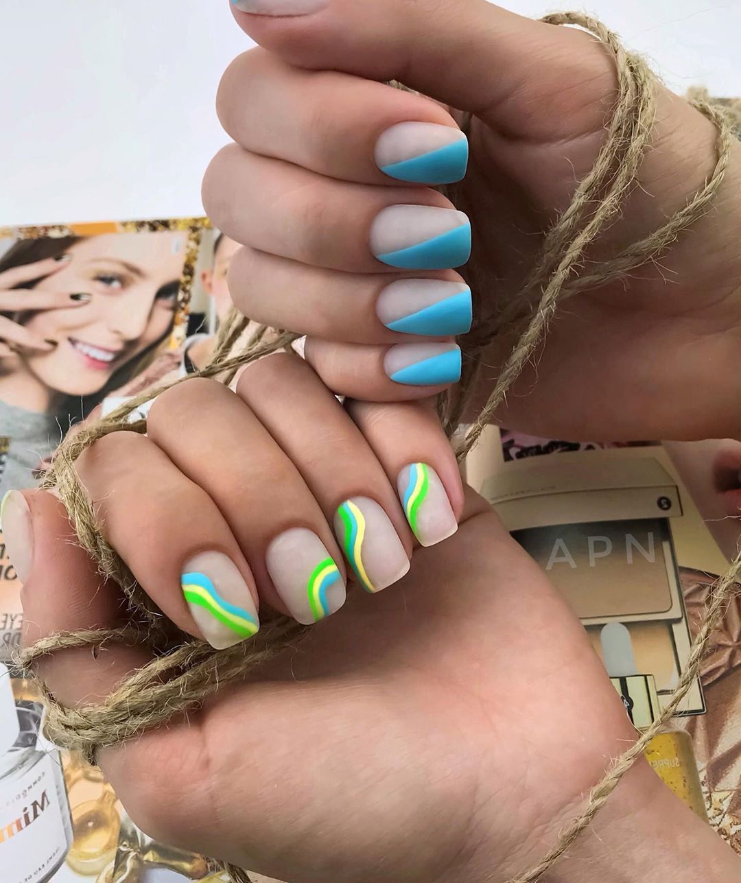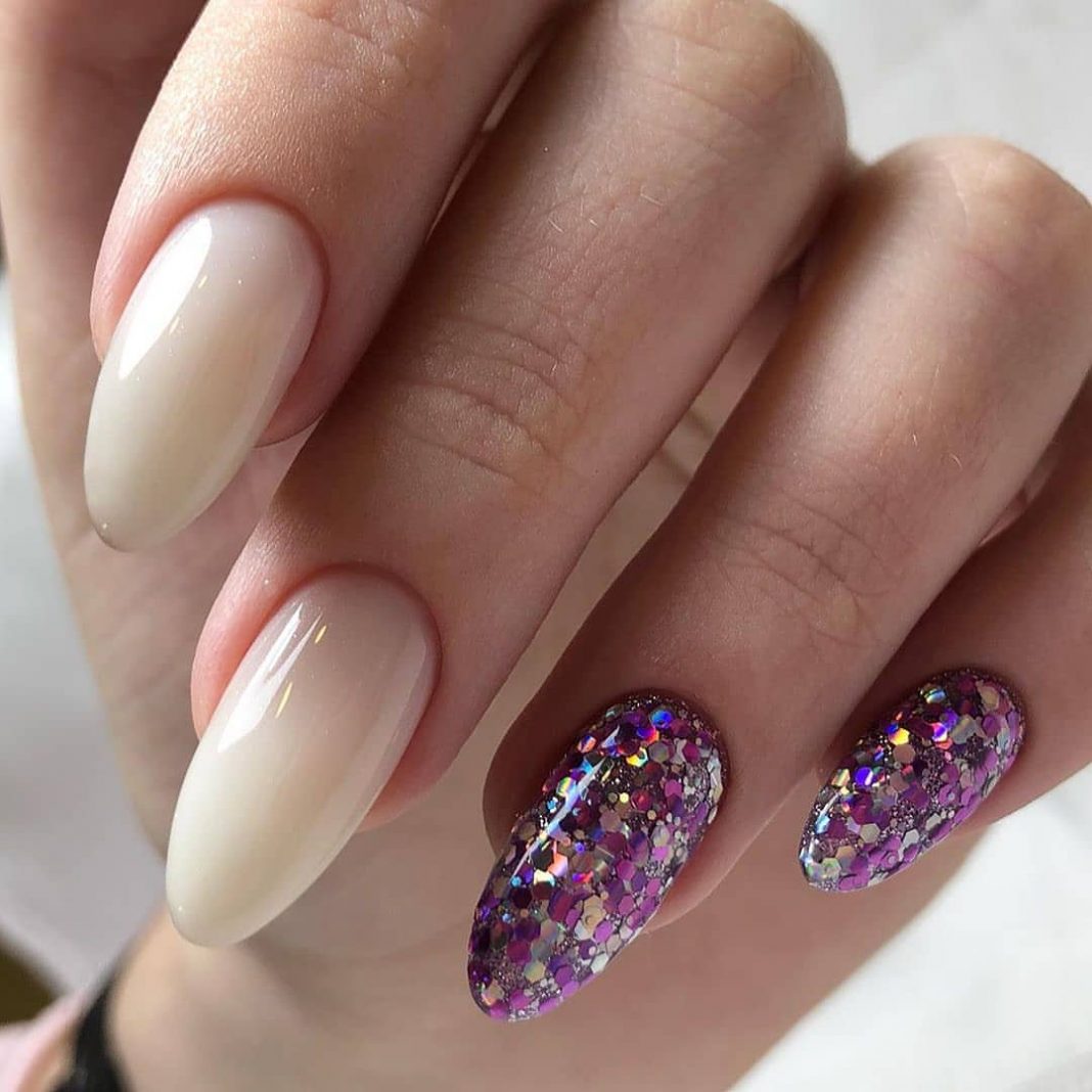 Какой модный маникюр можно представить без ярких переливающихся акцентов? Добавьте блеска с помощью глиттера и блесток, акриловой пудры. А вот от стразов в мае лучше отказаться. Конечно, при условии, что вы не планируете посетить праздник или торжественный вечер. Согласитесь, при работе на огороде или отдыхе с шашлыками, стразы на ногтях могут быть неуместными и делать маникюр непрактичным.
