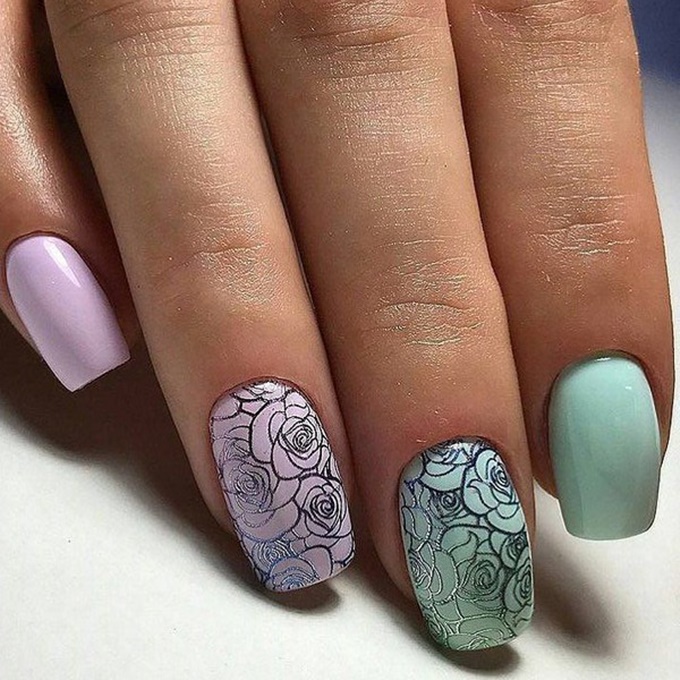 Обратите внимание — в мае для маникюра стоит использовать максимально нейтральные оттенки. Контрастные сочетания лучше оставить на лето. Рисунок стемпингом лучше наносить белым, серебристым или золотым лаком. Кстати, обратите внимание на такой модный прием, как многослойный стемпинг. Сначала мастер наносит базу, затем создает с помощью стемпинга рисунок. затем снова покрывает ногтевую пластину базовым лаком — лучше, если оттенок будет полупрозрачным, не закрывающим полностью первый рисунок. Теперь можно снова наносить стэмп рисунок. И затем уже укрывать весь майский дизайн основным цветом.