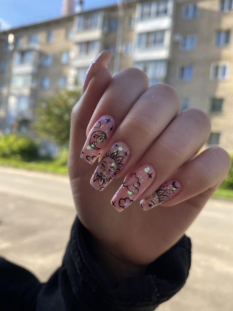 Как всегда, большая длина дает большое поле для экспериментов с дизайном ногтей. Вы можете выбрать для базы нежные пастельные цвета и украсить их цветами, фольгой или любым другим материалом. Отлично смотрятся наклейки, но если они мелкие и покрывают практически всю пластину, лучше выделить таким образом всего один-два ноготка на руке. Такого акцента будет достаточно для стильного образа.