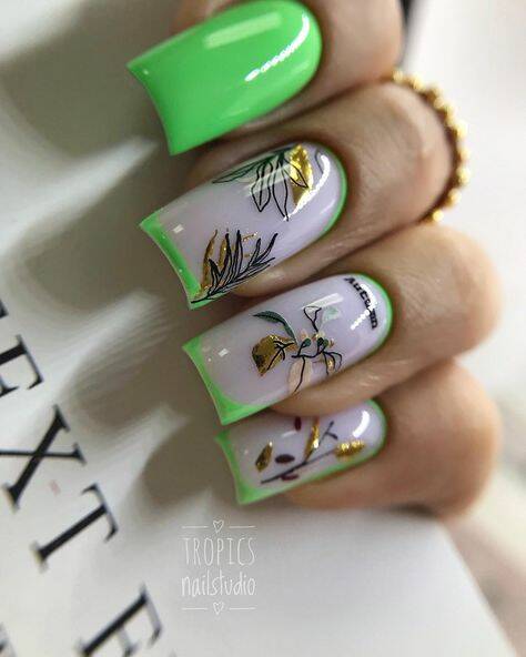 Если зимой мы активно рисовали на ногтях новогоднюю тематику, то весной стоит обратить внимание на птиц, бабочек, жуков и другую живность. Отлично смотрятся фрукты и даже овощи на ногтях. Рекомендуем обратить внимание на экзотические фрукты, которые добавят образу стиля.