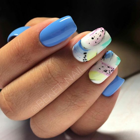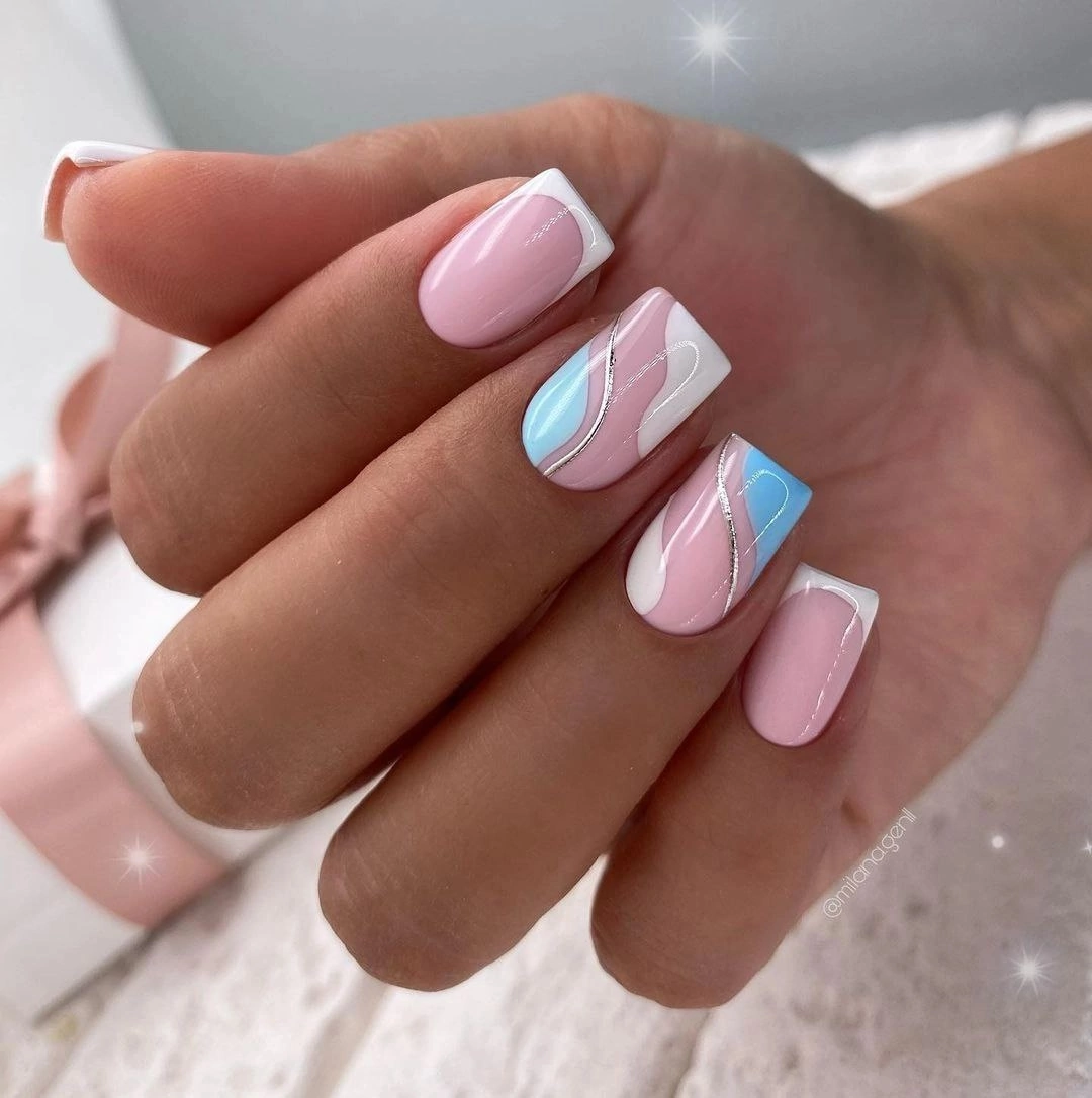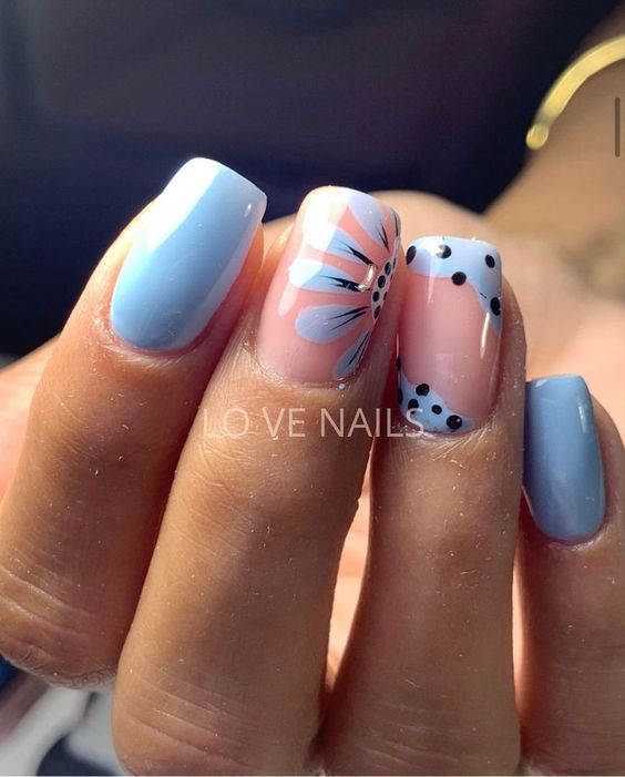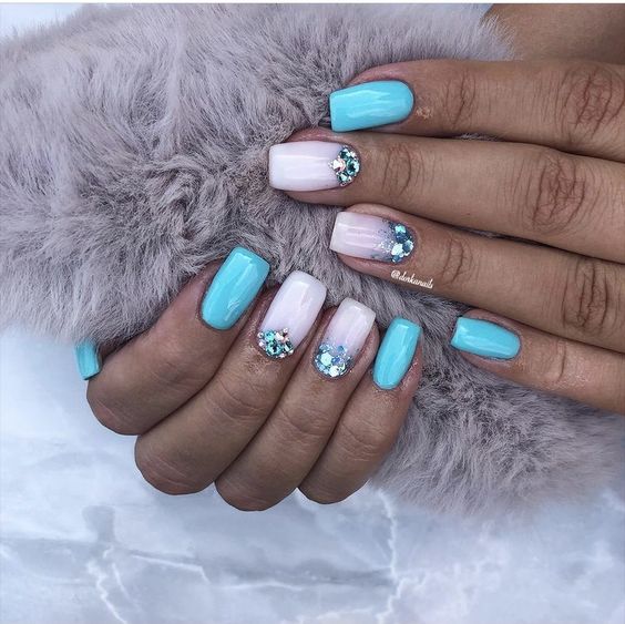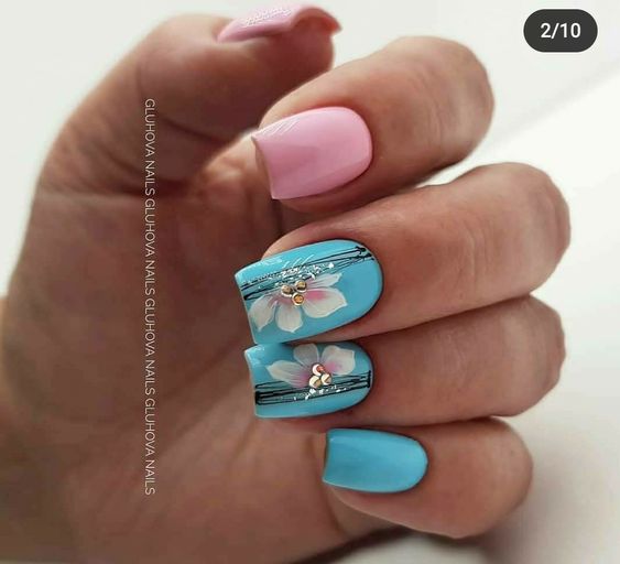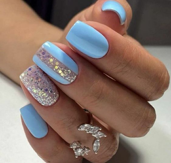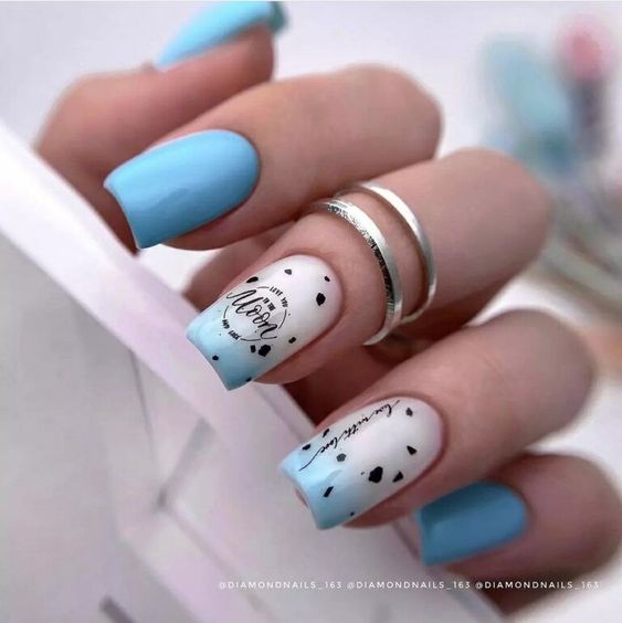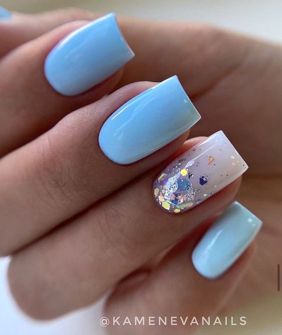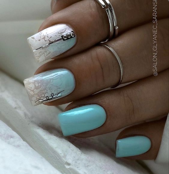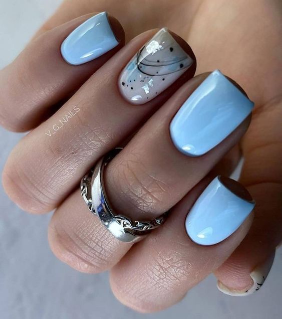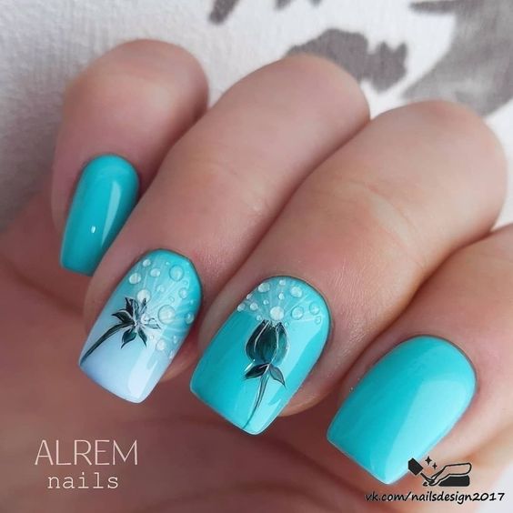 Голубой — это очень нежный маникюр, который подойдет обладательницам холодного цветотипа. Хотя в богатой палитре этого оттенка вы найдете и тот, который подойдет брюнеткам или рыжим модницам. Для мягкого квадрата подходят практически все варианты дизайна. Ограничением здесь будет только ваша фантазия.