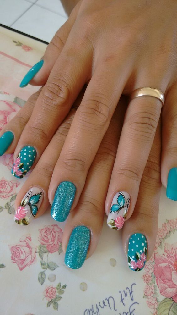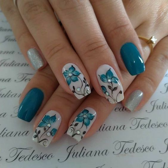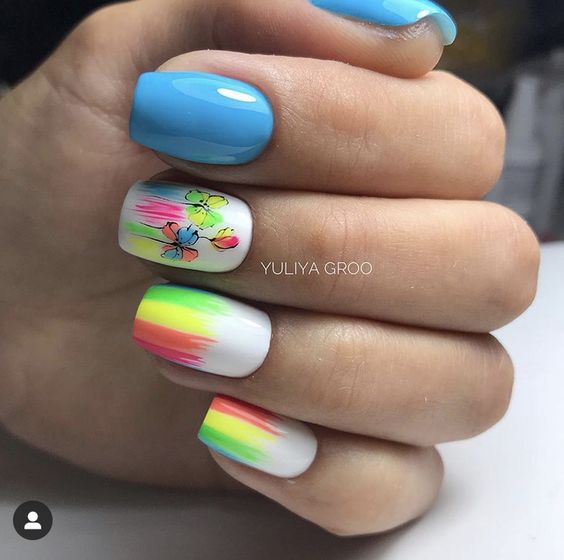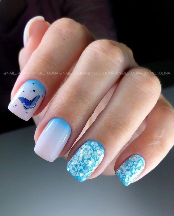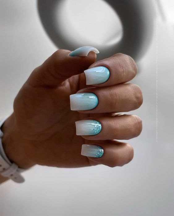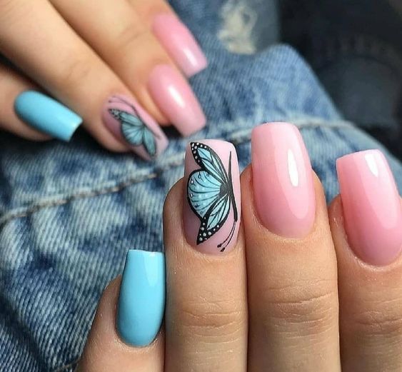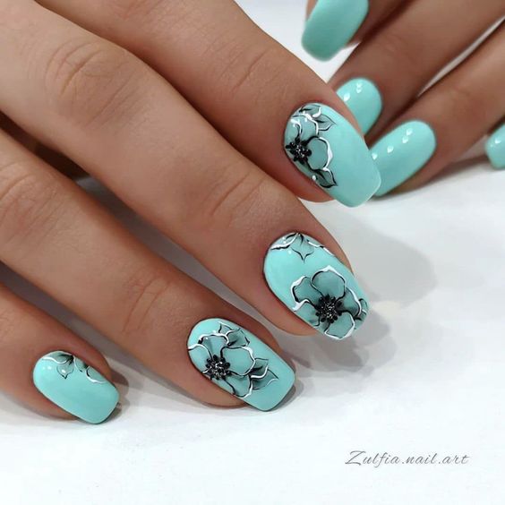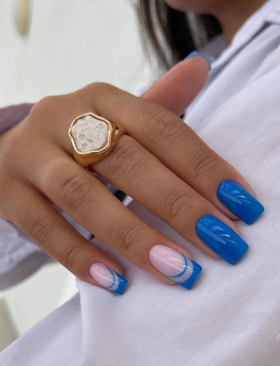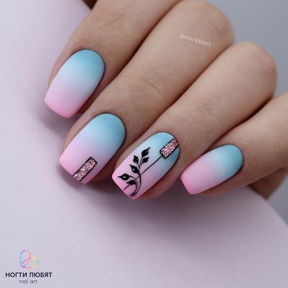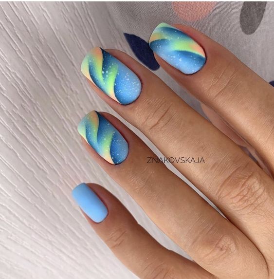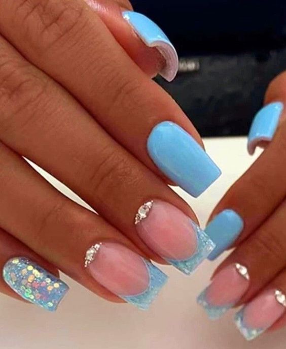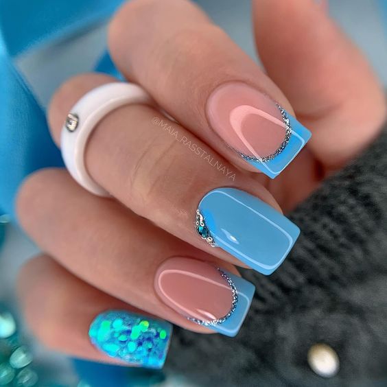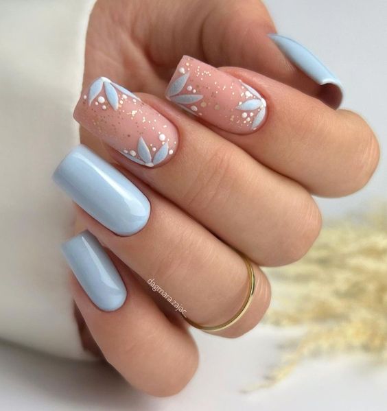 Голубой — это очень нежный маникюр, который подойдет обладательницам холодного цветотипа. Хотя в богатой палитре этого оттенка вы найдете и тот, который подойдет брюнеткам или рыжим модницам. Для мягкого квадрата подходят практически все варианты дизайна. Ограничением здесь будет только ваша фантазия.