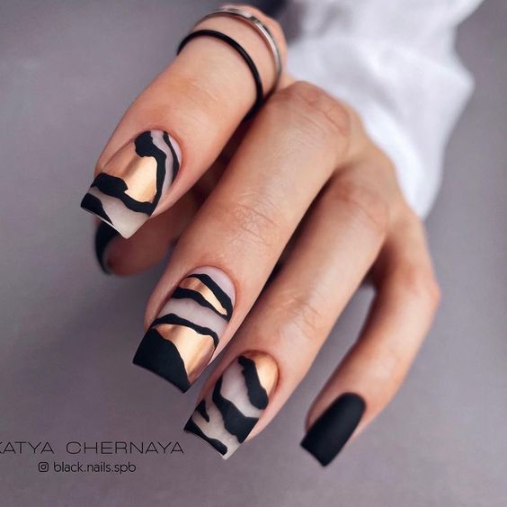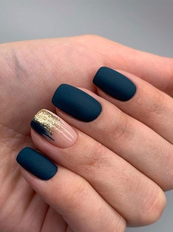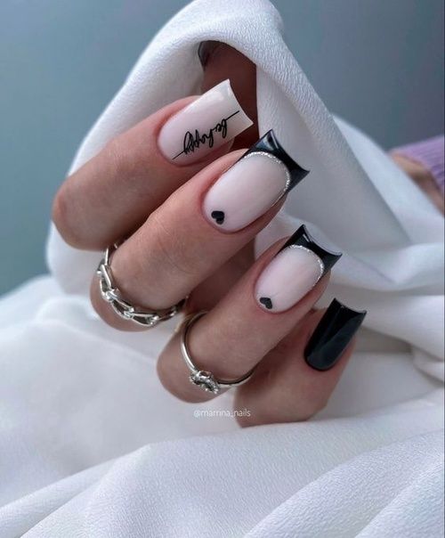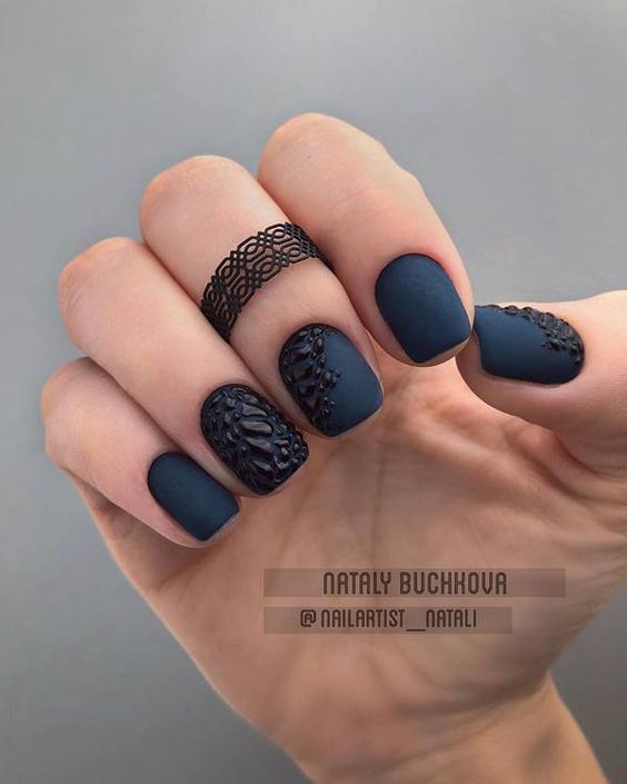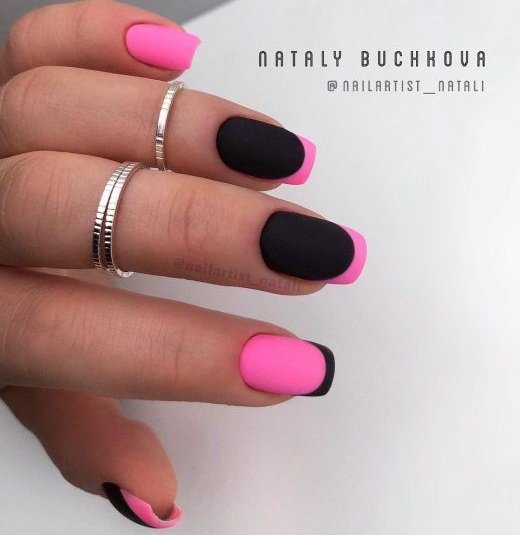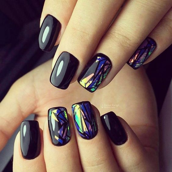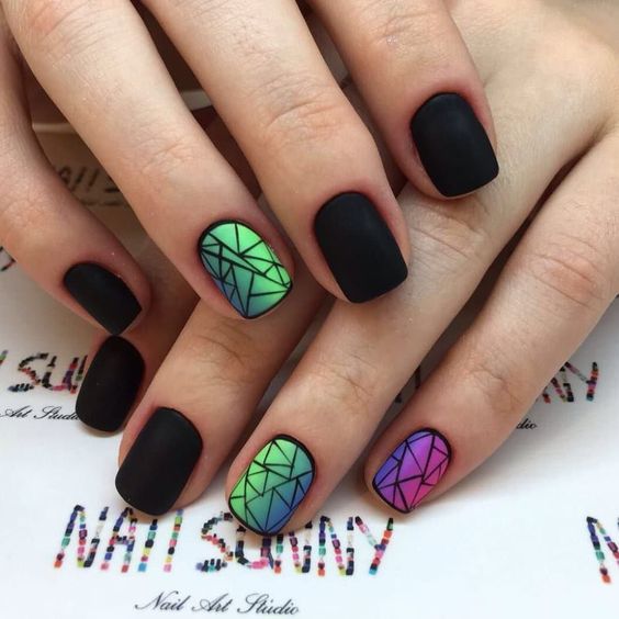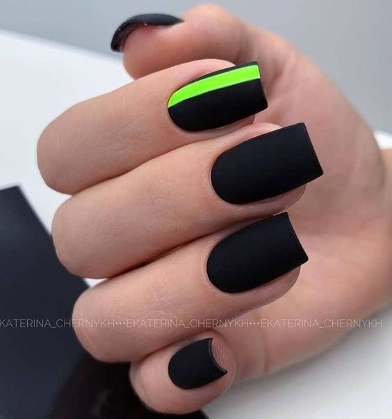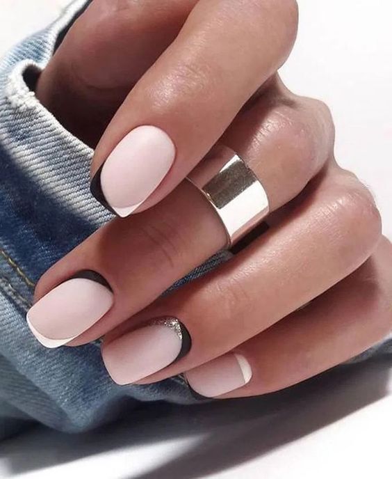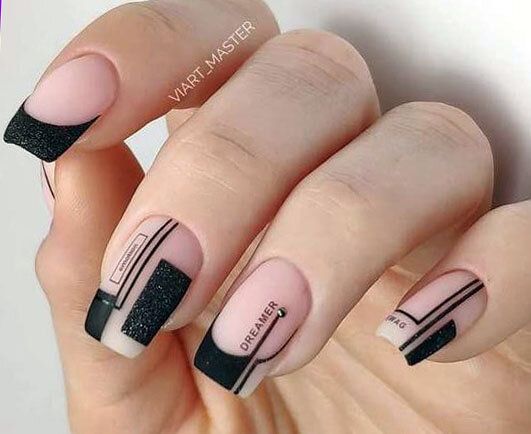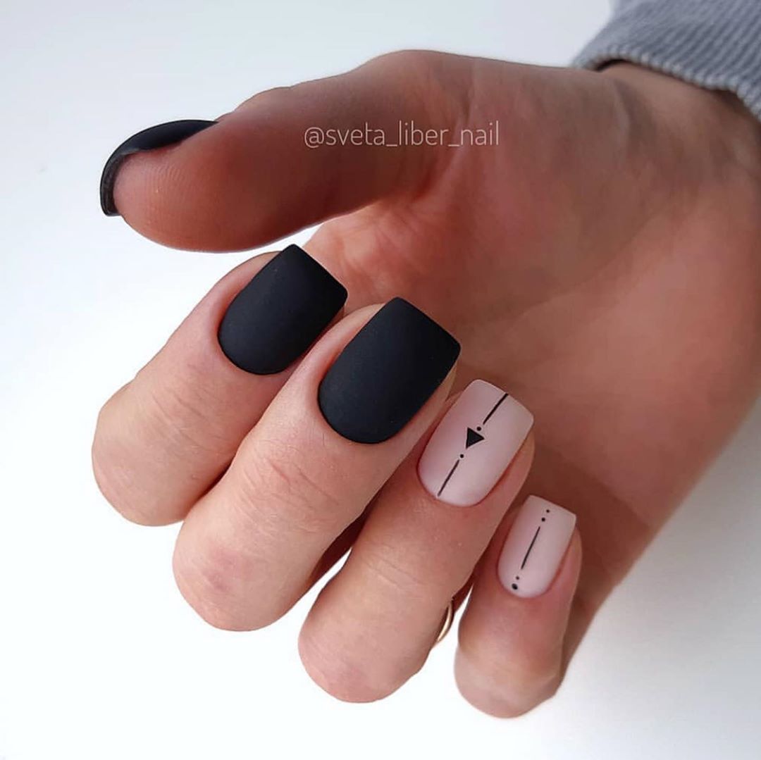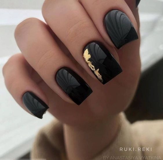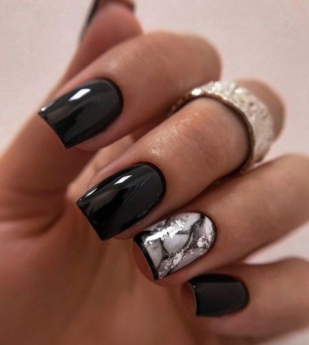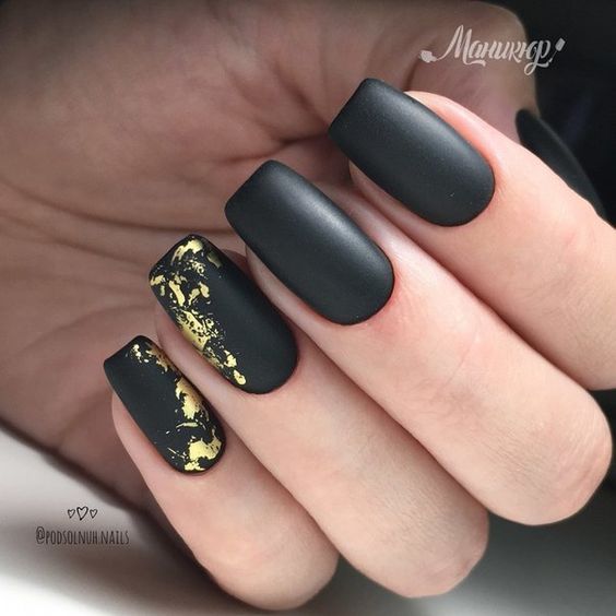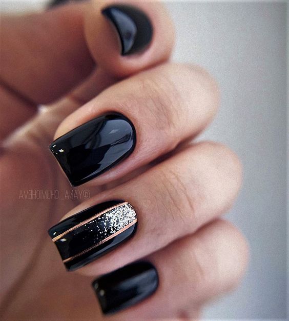 Строгий и очень стильный маникюр на форму мягкий квадрат можно сделать, если использовать черный густой цвет. Кстати, очень стильно и нежно он смотрится в матовом исполнении. Если боитесь, что маникюр будет смотреться очень мрачно, разбавьте царство черного нюдовыми или другими оттенками.