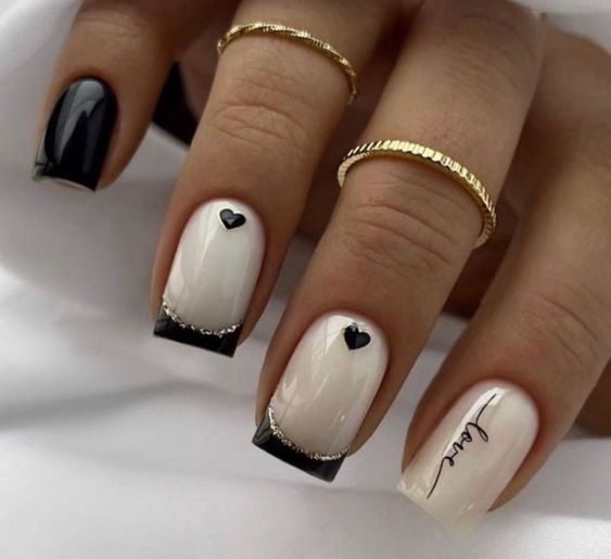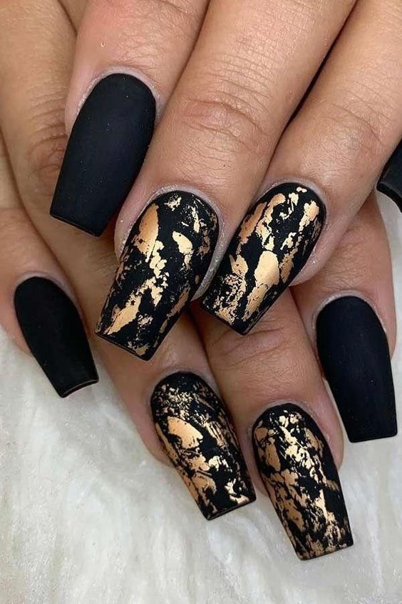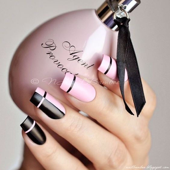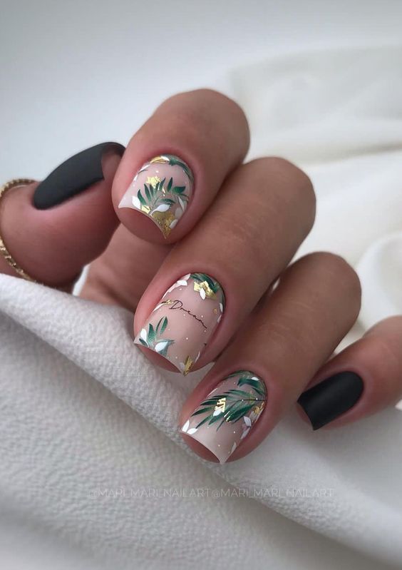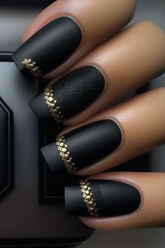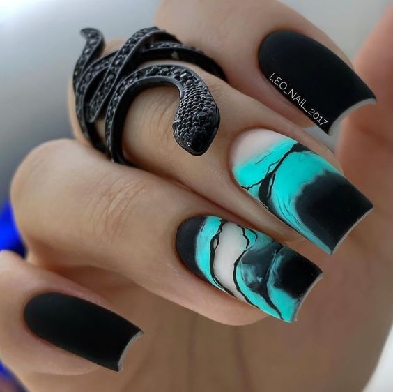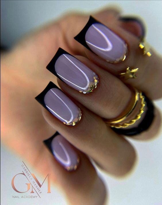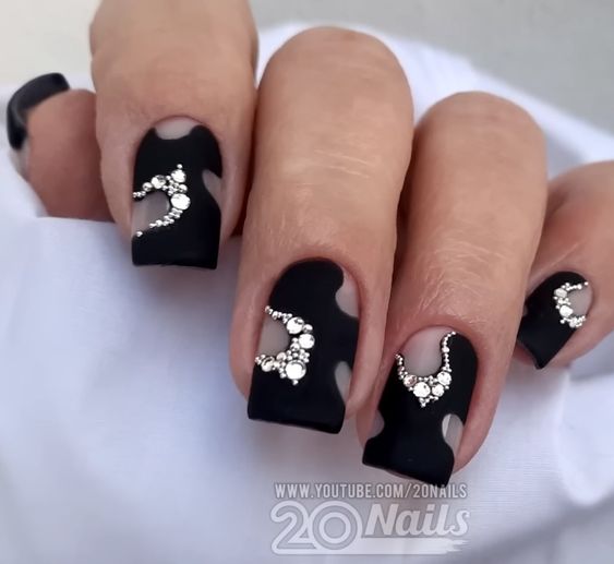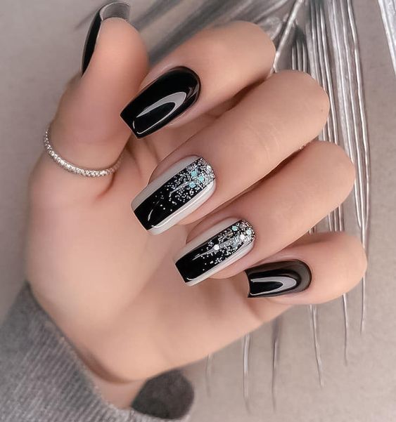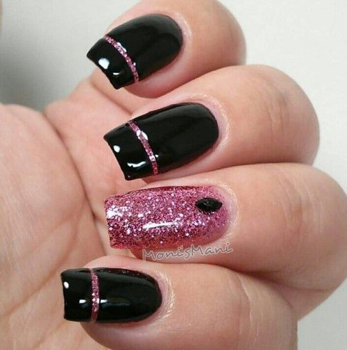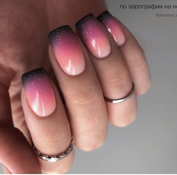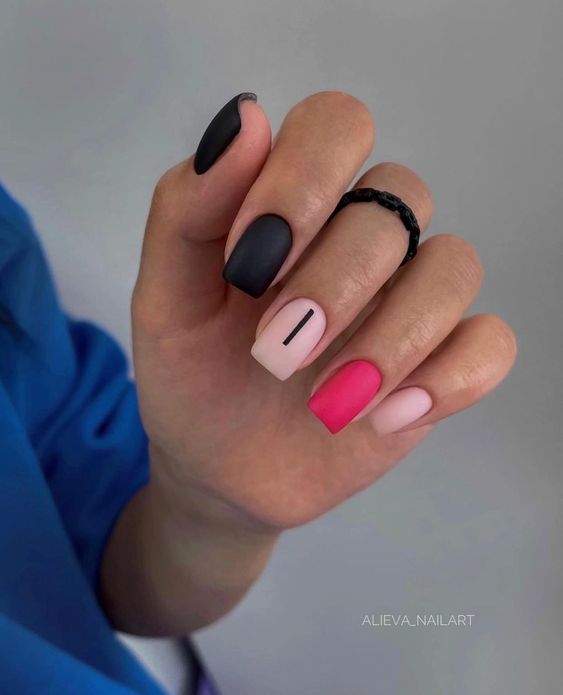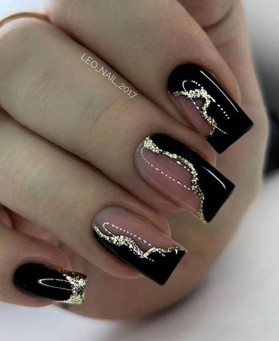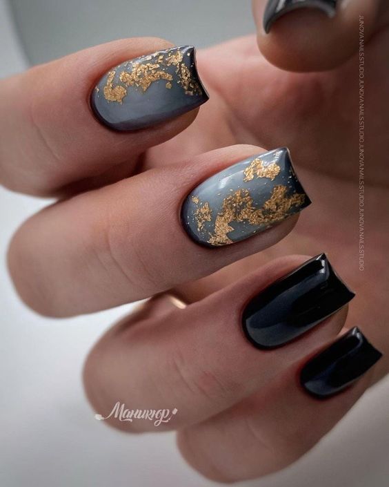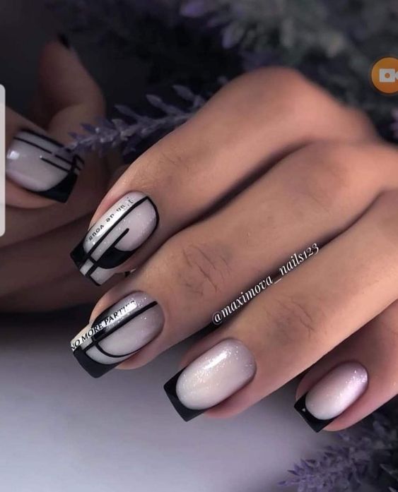Строгий и очень стильный маникюр на форму мягкий квадрат можно сделать, если использовать черный густой цвет. Кстати, очень стильно и нежно он смотрится в матовом исполнении. Если боитесь, что маникюр будет смотреться очень мрачно, разбавьте царство черного нюдовыми или другими оттенками.