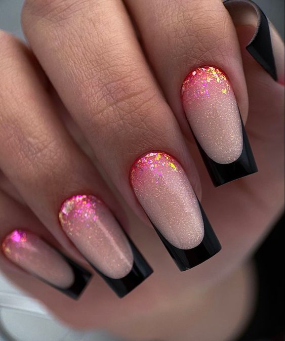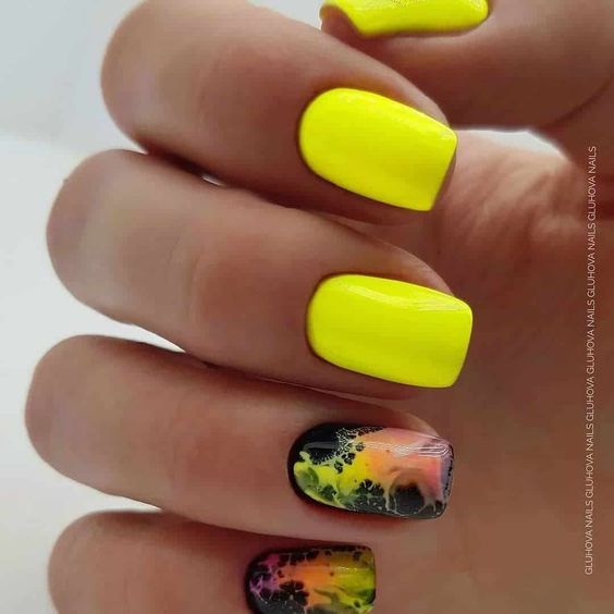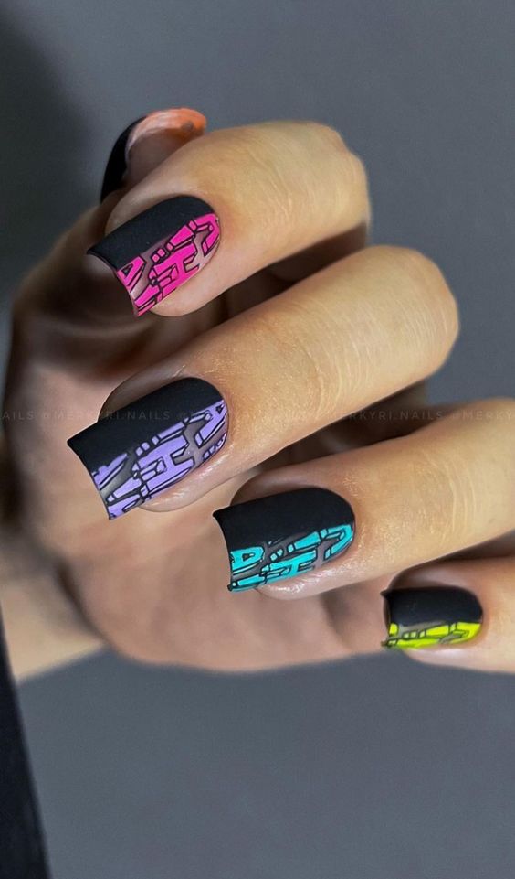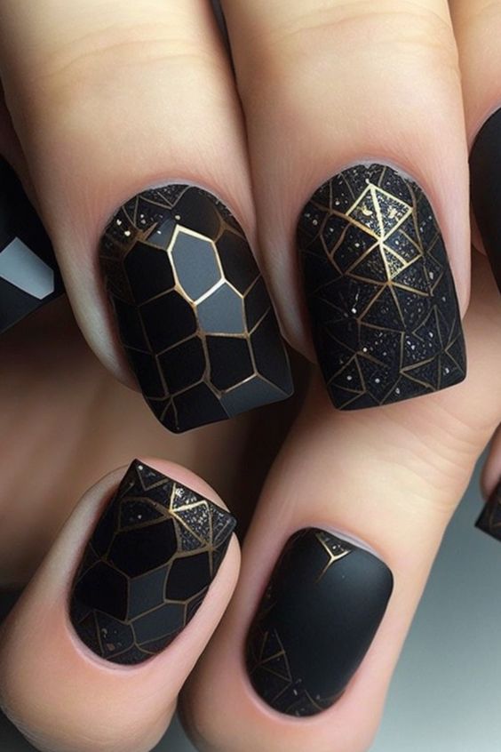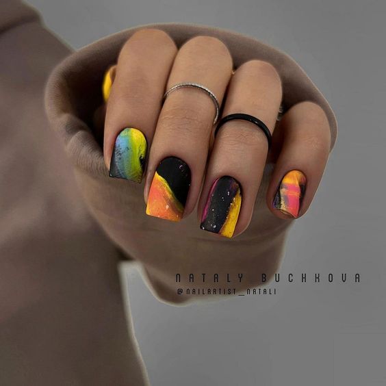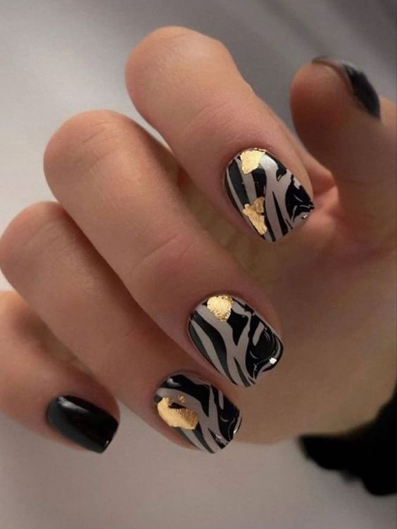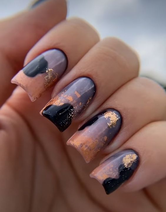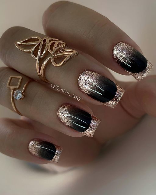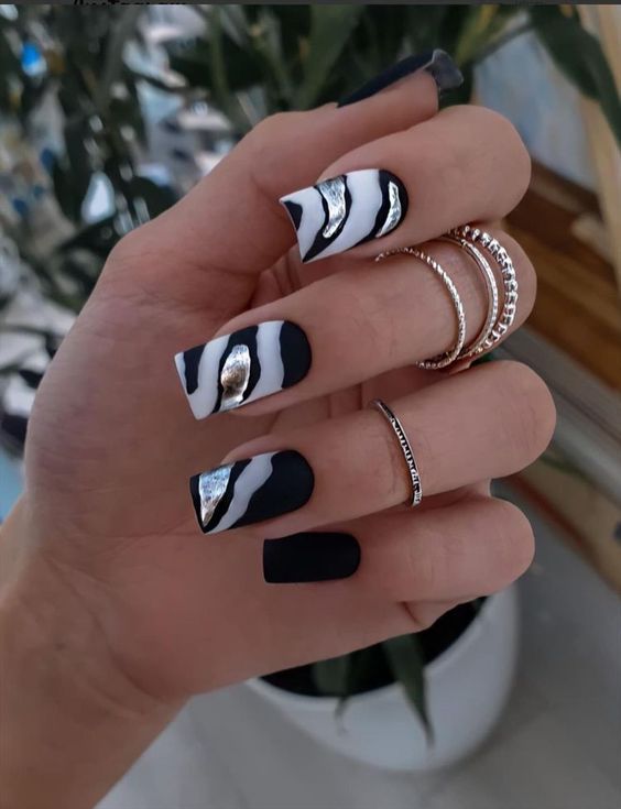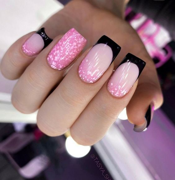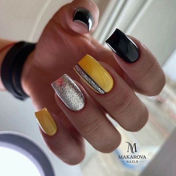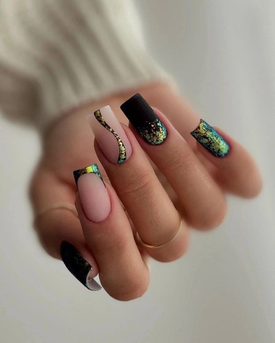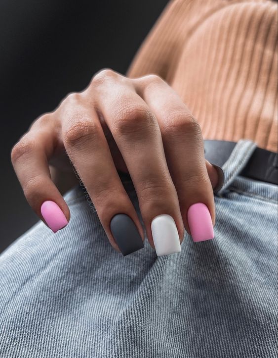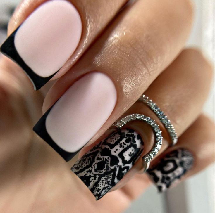 Строгий и очень стильный маникюр на форму мягкий квадрат можно сделать, если использовать черный густой цвет. Кстати, очень стильно и нежно он смотрится в матовом исполнении. Если боитесь, что маникюр будет смотреться очень мрачно, разбавьте царство черного нюдовыми или другими оттенками.