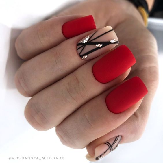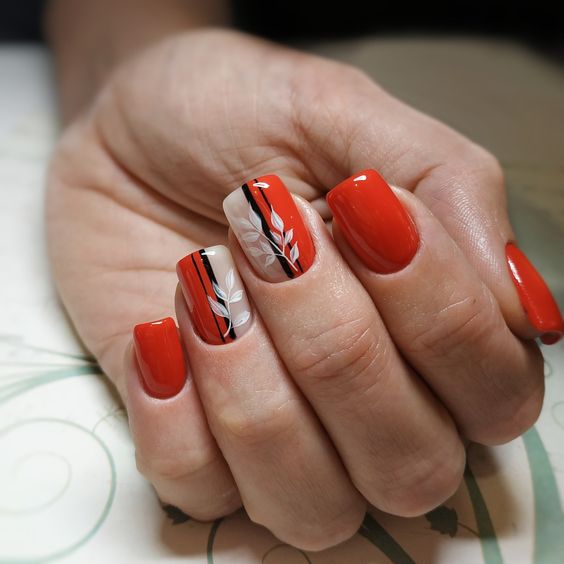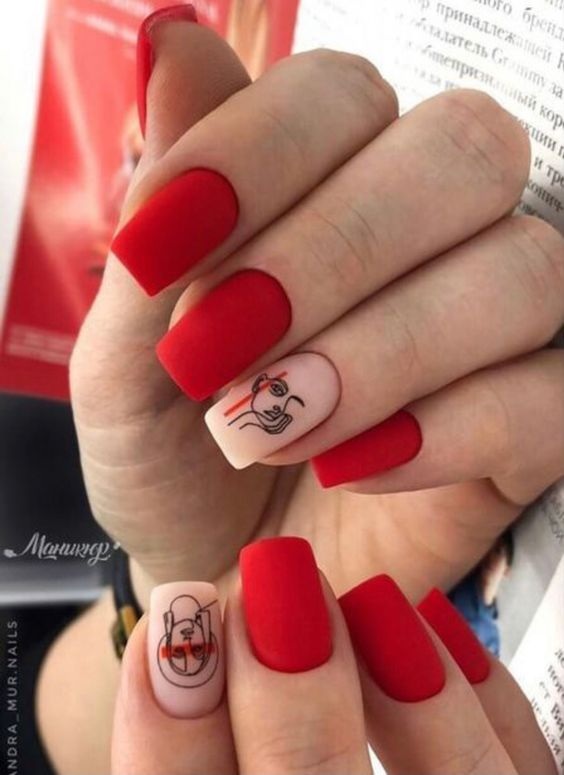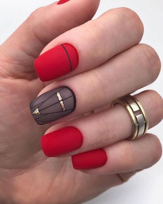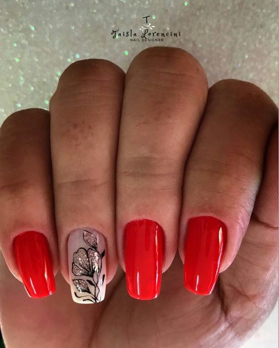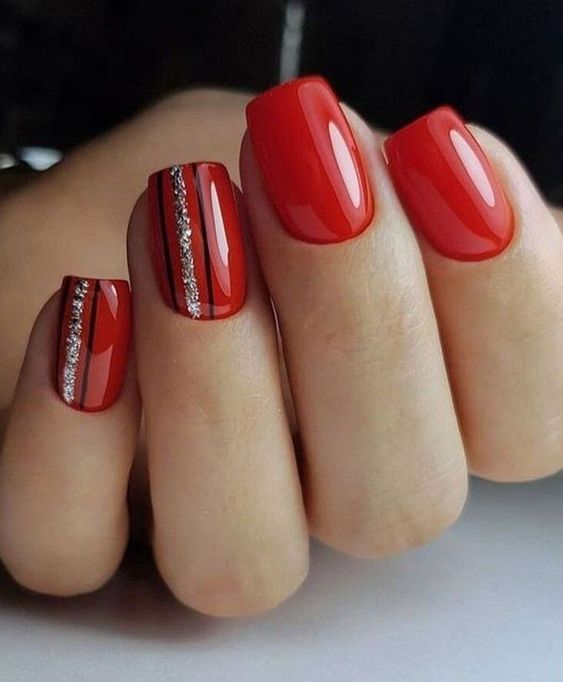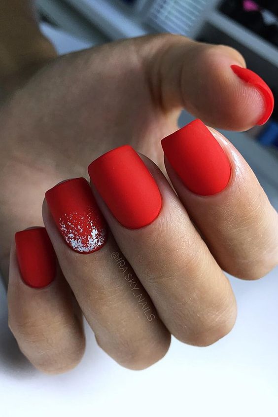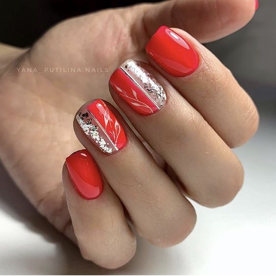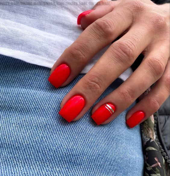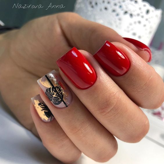 Хотите сделать максимально заметный и стильный маникюр? Дополните форму мягкий квадрат красным ярким лаком. Текстура может быть глянцевой или матовой. Дополнить дизайн можно яркими акцентами. Например, рисунком паутинка и тонкими вкраплениями фольги. При выборе конкретного оттенка с красной палитрой ориентируйтесь на сезонность. Например, летом очень актуальны коралловые и viva magento.