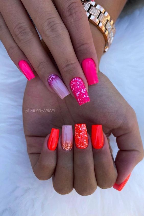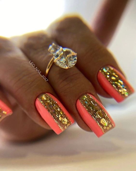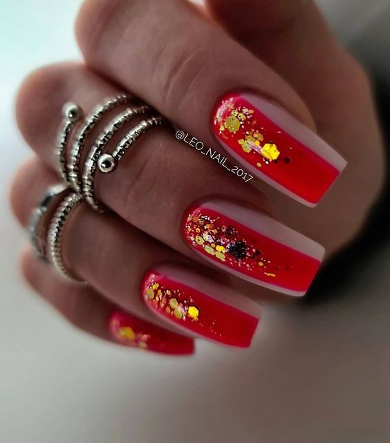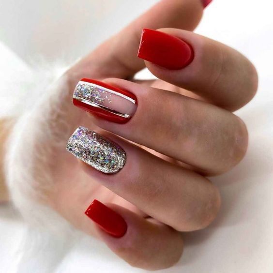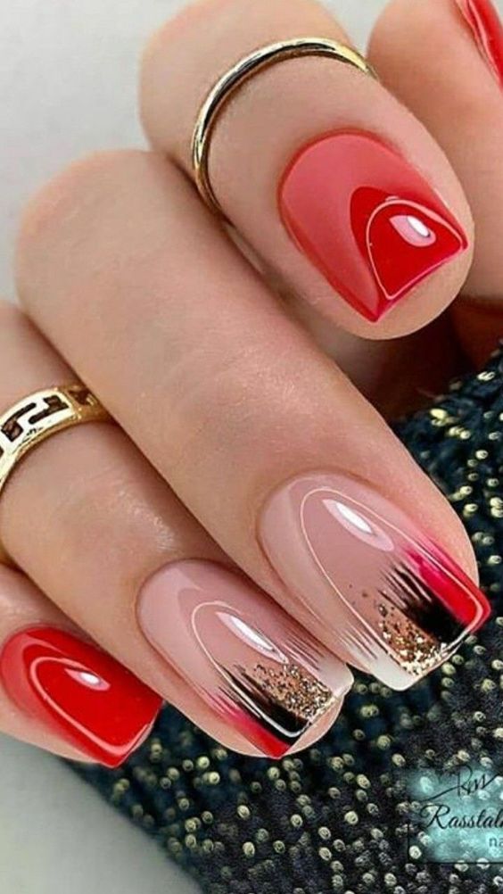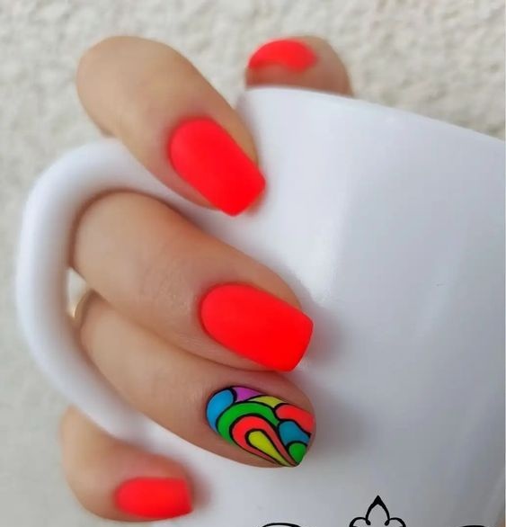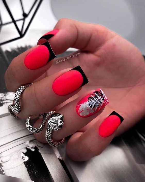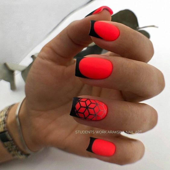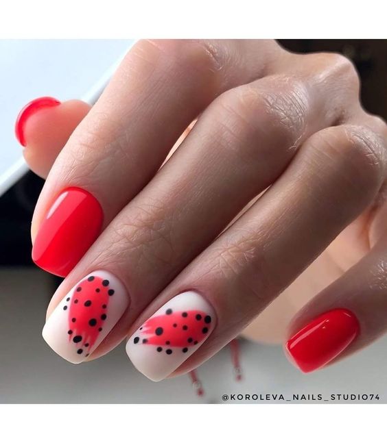 Хотите сделать максимально заметный и стильный маникюр? Дополните форму мягкий квадрат красным ярким лаком. Текстура может быть глянцевой или матовой. Дополнить дизайн можно яркими акцентами. Например, рисунком паутинка и тонкими вкраплениями фольги. При выборе конкретного оттенка с красной палитрой ориентируйтесь на сезонность. Например, летом очень актуальны коралловые и viva magento.