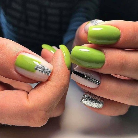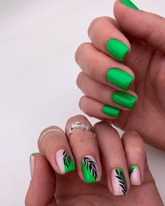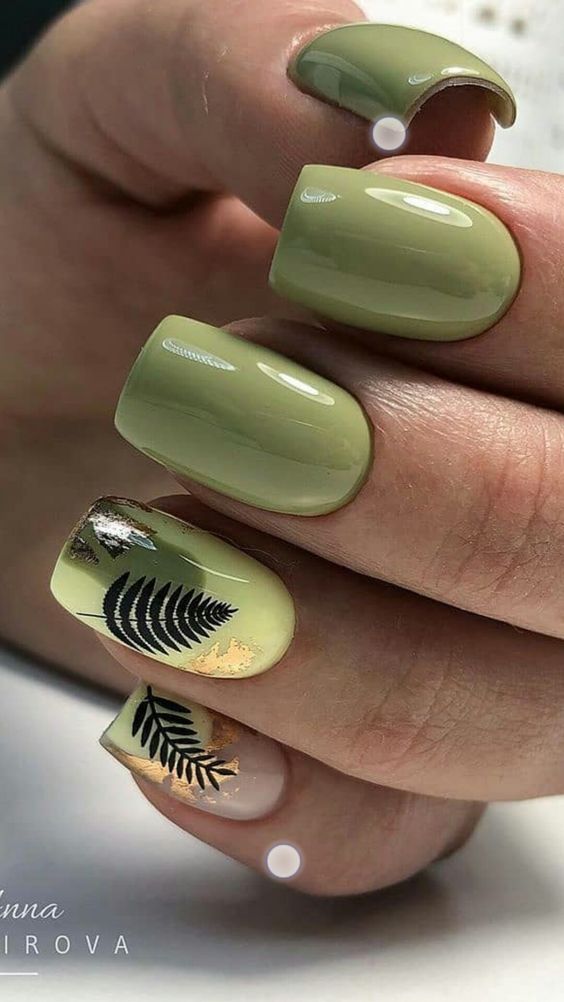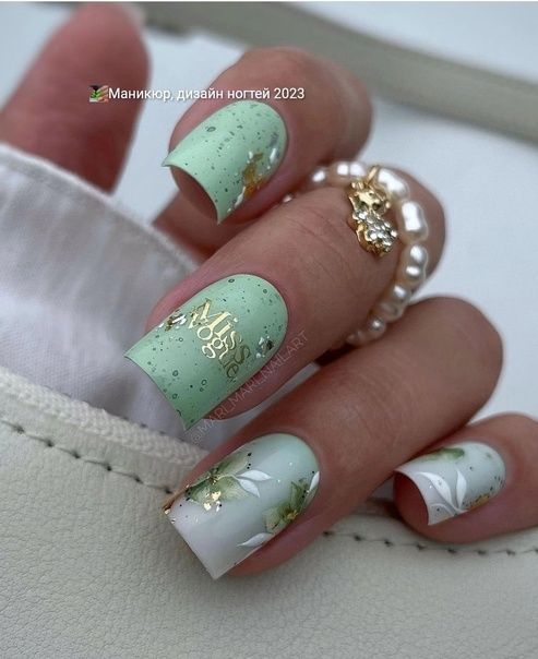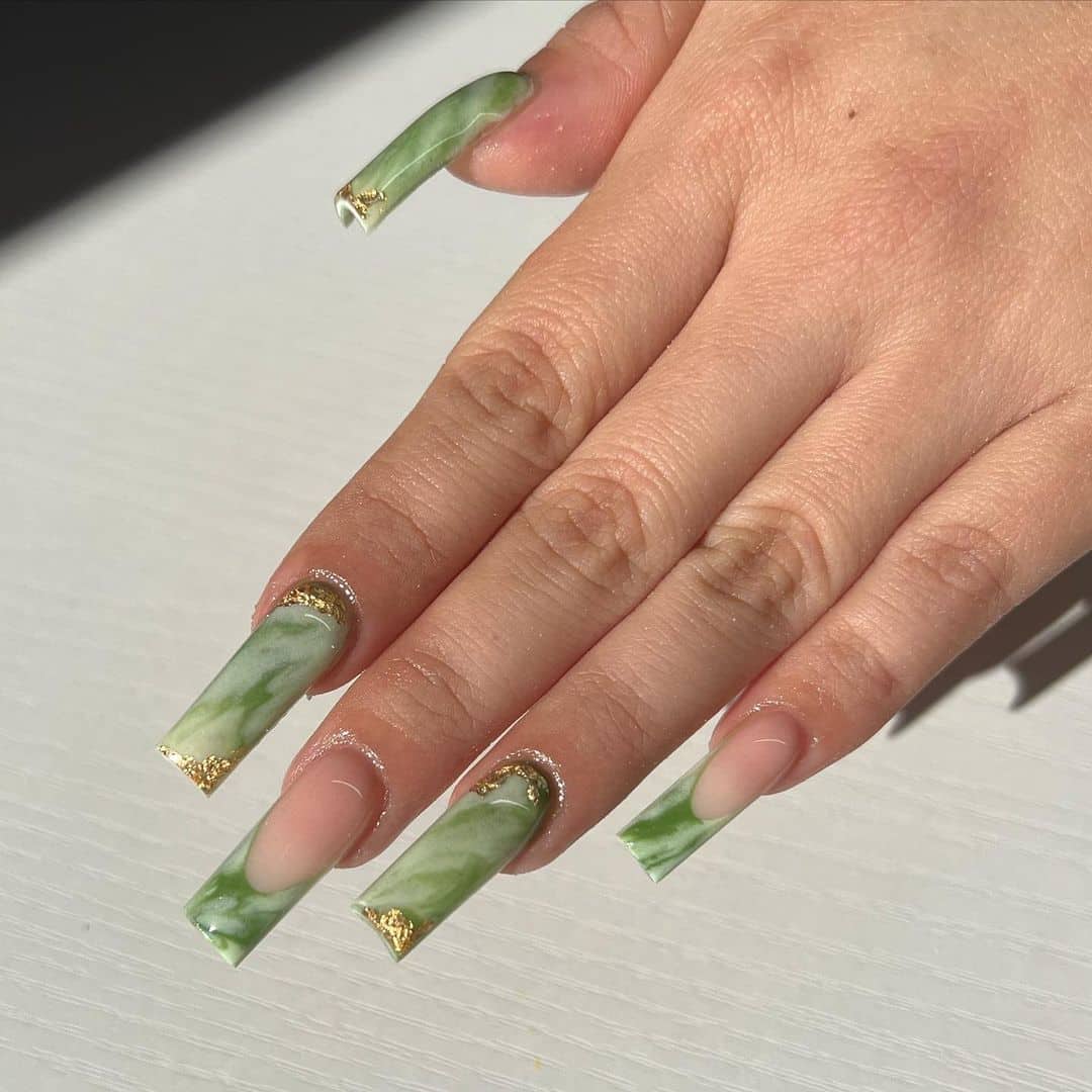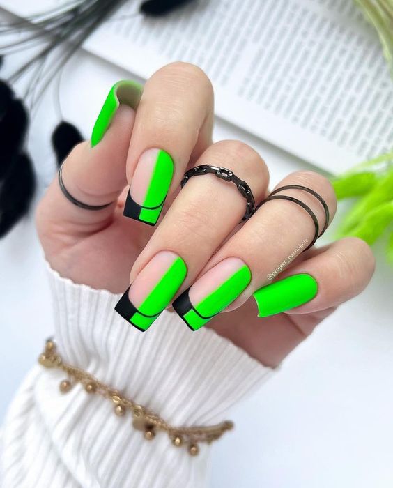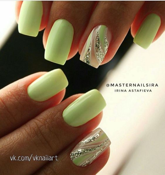 Вы удивитесь, сколько стильных вариантов маникюра на мягкий квадрат можно сделать с помощью зеленого цвета. Например, используйте молочную полупрозрачную основу для оформления всех ноготков. Затем выделите тонкую красивую улыбку френча зеленым. Один или два ноготка на руке покройте матовым зеленым цветом.