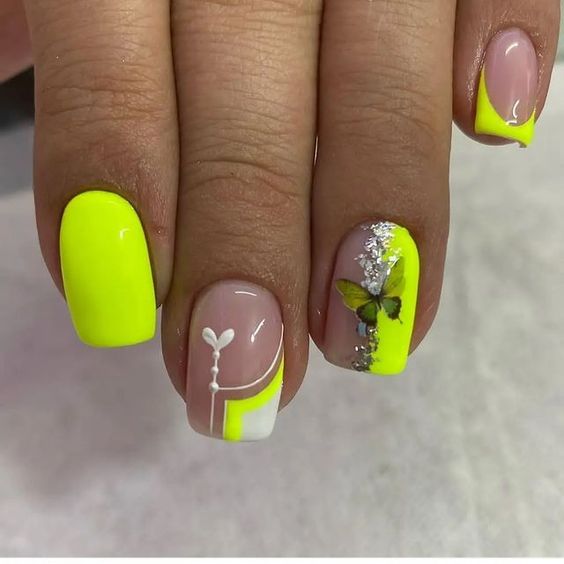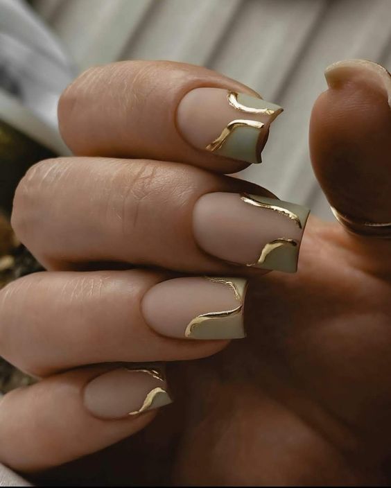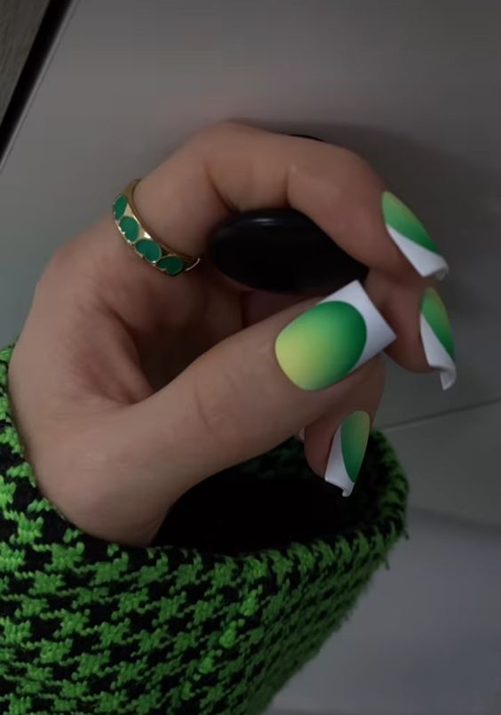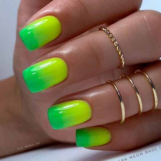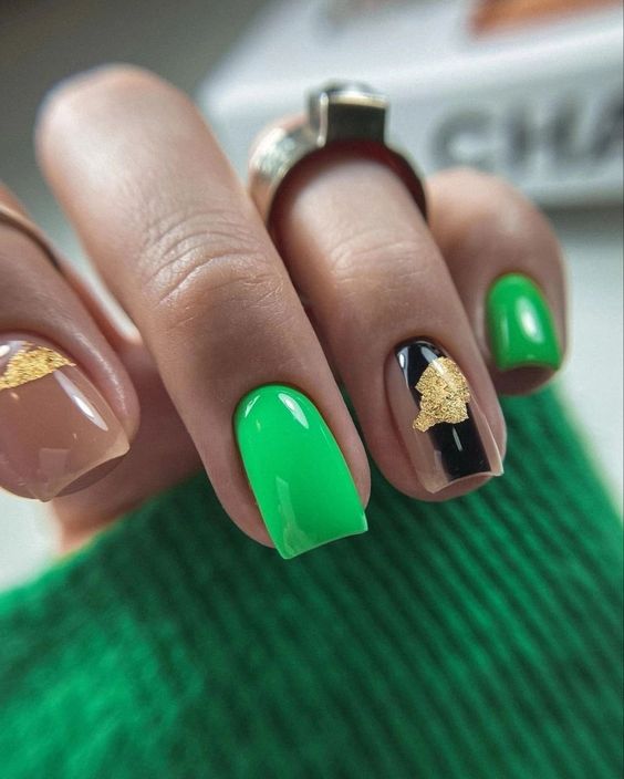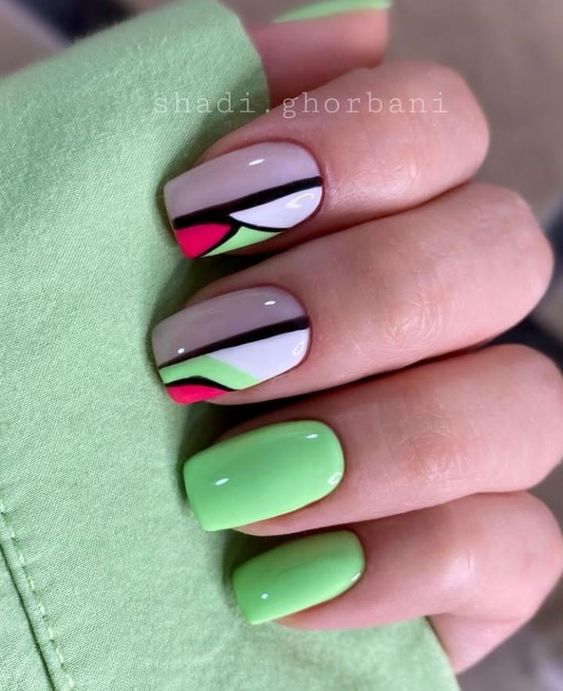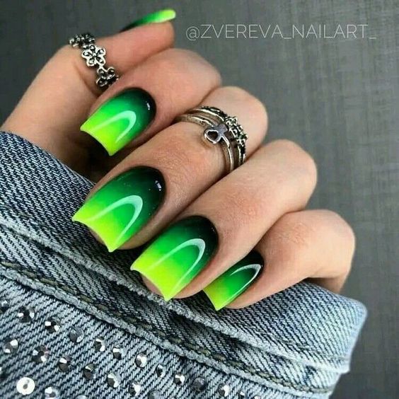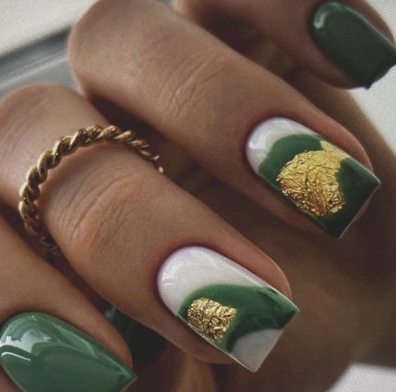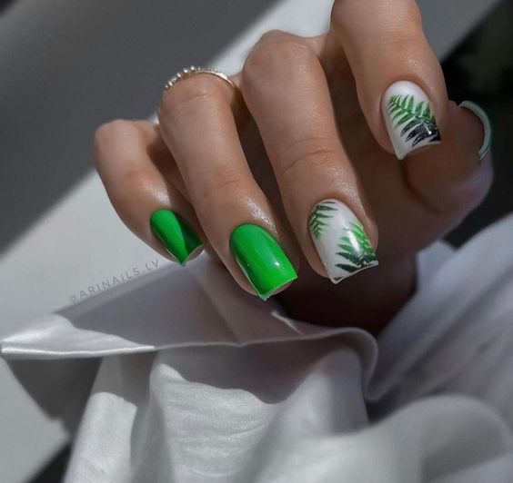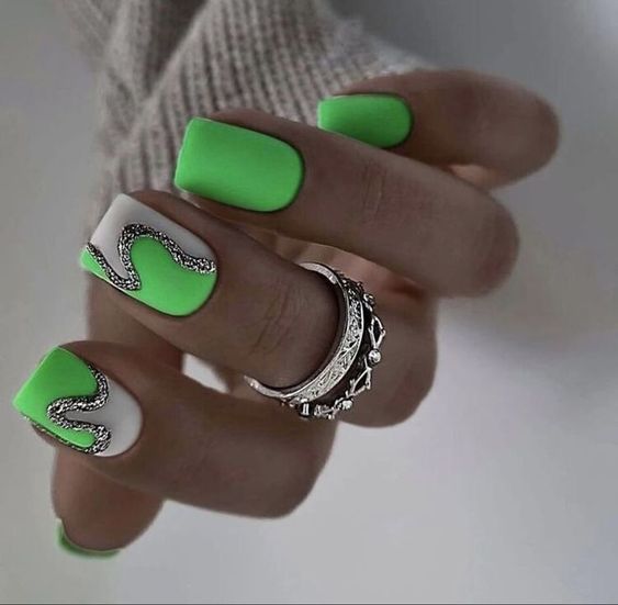Вы удивитесь, сколько стильных вариантов маникюра на мягкий квадрат можно сделать с помощью зеленого цвета. Например, используйте молочную полупрозрачную основу для оформления всех ноготков. Затем выделите тонкую красивую улыбку френча зеленым. Один или два ноготка на руке покройте матовым зеленым цветом.