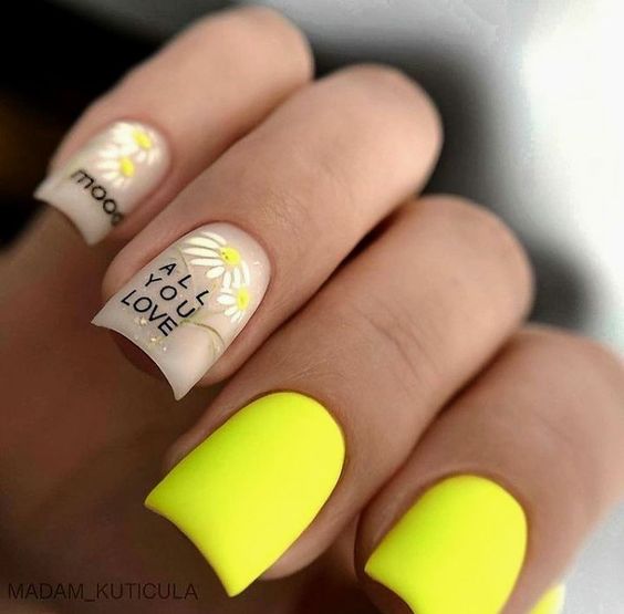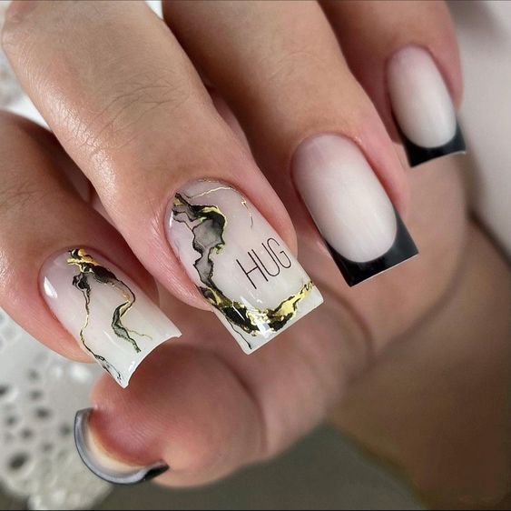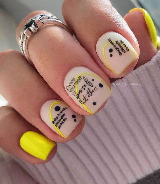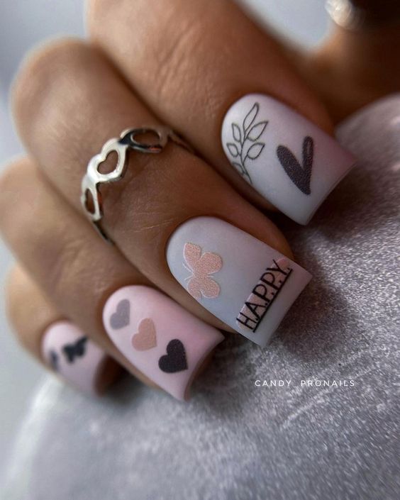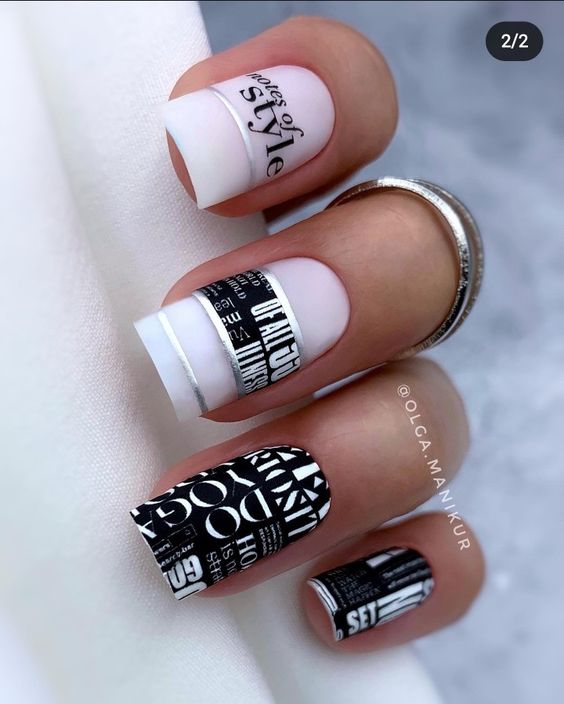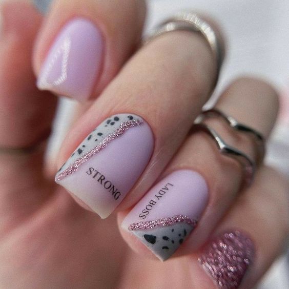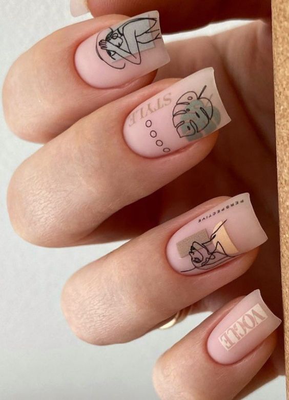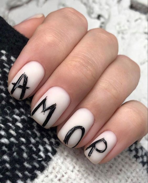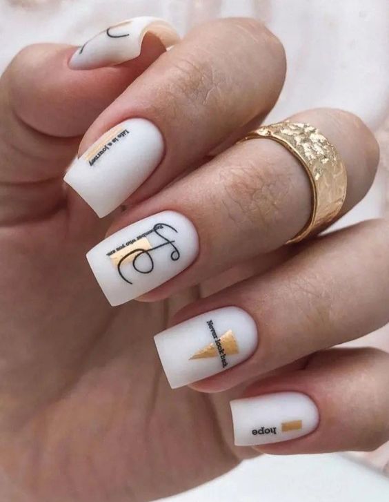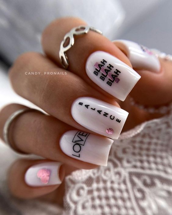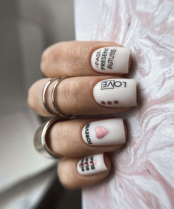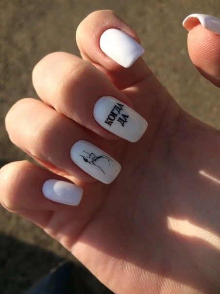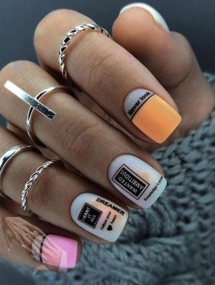 Очень эффектным представляется маникюр на мягкий квадрат с надписями на ногтях. Интересный шрифт, который отображает красивую или важную для человека надпись — это очень модно и актуально. Таким образом можно признаться в любви, выразить свои мысли или поздравить окружающих с праздником. Выбирайте, что для вас актуально на данный момент и фантазируйте.
