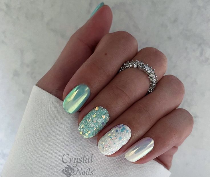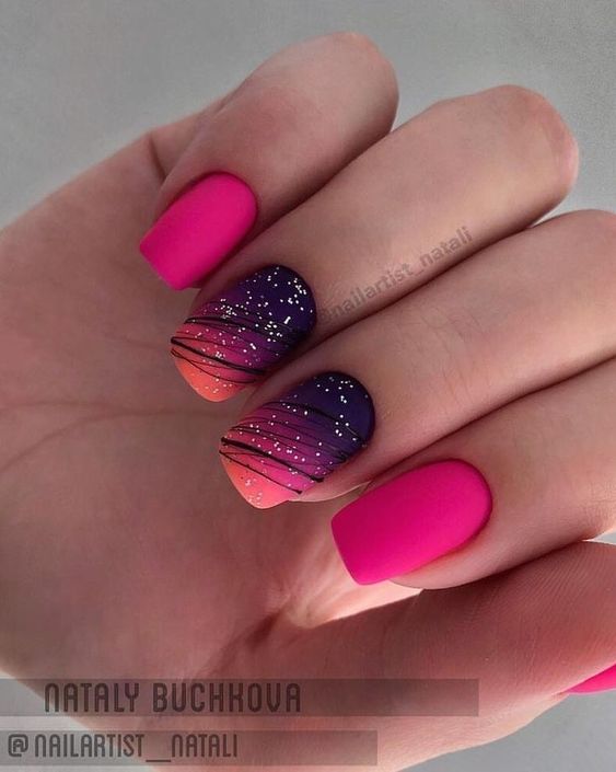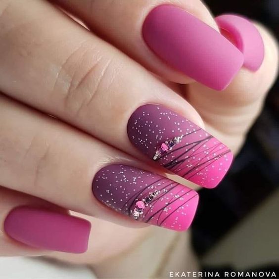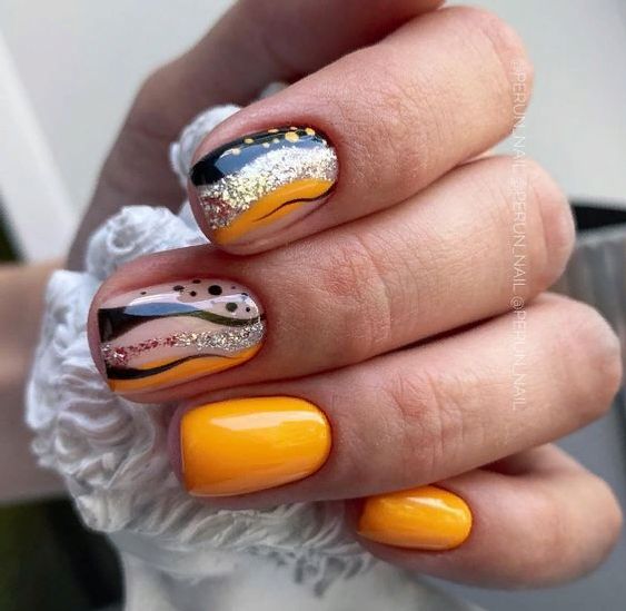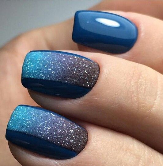 Начать стоит с простого однотонного маникюра, который, как это не удивительно, является одним из основных трендов сезона. Если вы планируете остаться в рамках одного цвета, постарайтесь поиграть с текстурами и блеском. Например, используйте матовую поверхность, которая сделает ноготки бархатными и очень привлекательными. На нее можно нанести блестящий узор. А вот глянцевые текстуры больше подойдут, как фон для пудрового или бархатного рисунка. Ну и, конечно, стоит по максимуму использовать глиттер. Кстати, основной тренд сезона — это все же акцентные ногти. Каким бы удивительно красивым не был выбранный вами дизайн, оформлять в таком стиле все ноготки — не самое актуальное решение.
