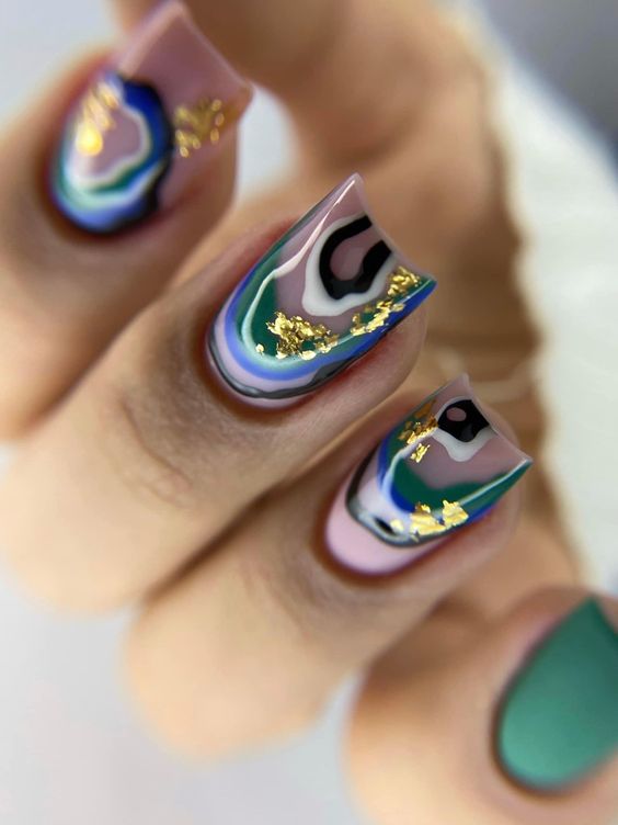 У этой модной техники есть и другие названия. Например, жидкий камень, слеза единорога, капли металла и другие. Техника заключается в особом способе нанесения нескольких слоев разных составов, которые создают на ногти объемную имитация драгоценных камней, капель расплавленного металла. Этот маникюр можно отнести к 3d. Отметим, что создать довольно маленькие капельки в этой технике проблематично, поэтому рекомендуем использовать такой дизайн обладательницам средней и большой длинны.