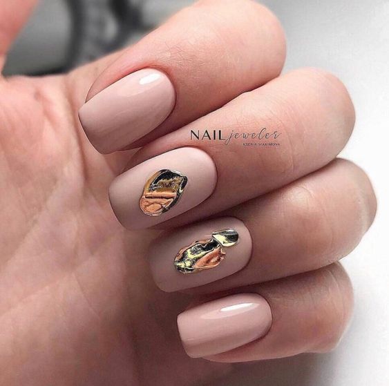 В этом случае речь идет даже не о цвете. Одно из основных и очень модных направлений этого сезона в нейл-арте — это так называемый голый маникюр. Для его создания необходимо выбирать самые нейтральные и естественные оттенки лака. Нюдовый маникюр можно использовать как самостоятельный дизайн. А также может стать отличной базой для размещения на нем минималистичных, анималистичных, флористических или геометрических принтов. Эффектно смотрится и металлизированные втирка на естественном покрытии. От слишком активных блестящих элементов в этом случае лучше отказаться. Стразы блестки лучше заменить на фольгу.