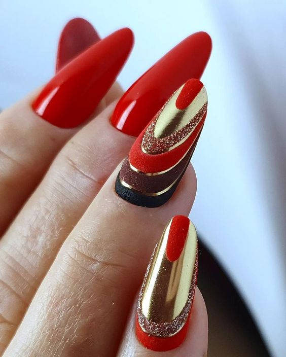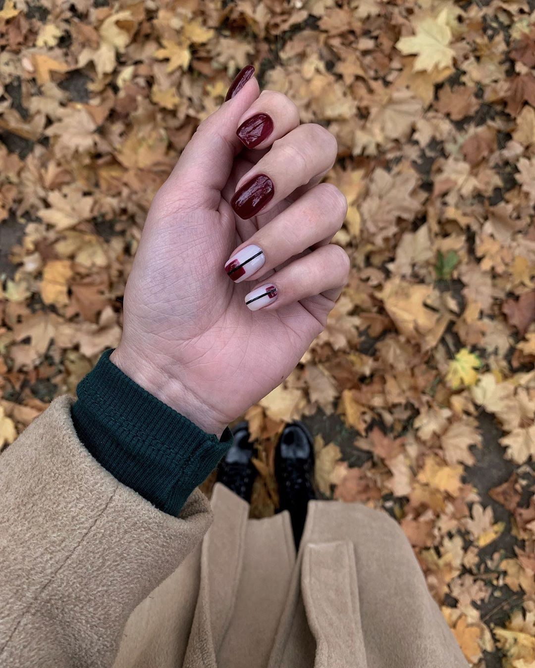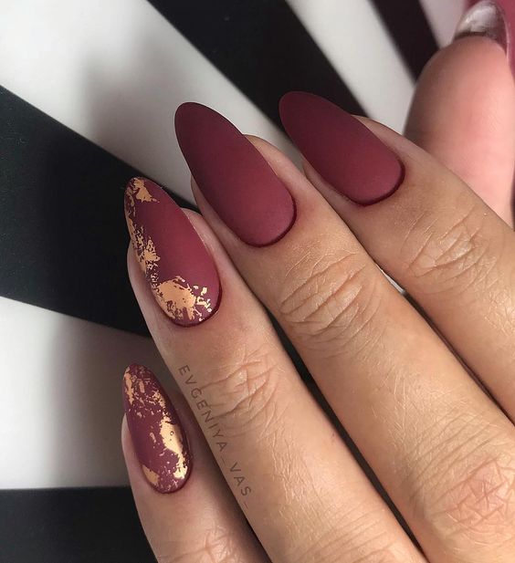 - темно-красный: такие оттенки, как бордовый, шоколадно-красный или вишневый, идеально вписываются в осенне-зимний сезон. Они придают ногтям элегантность и глубину;
