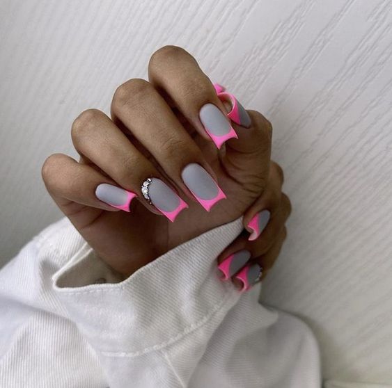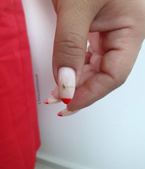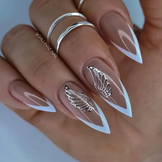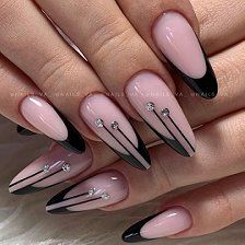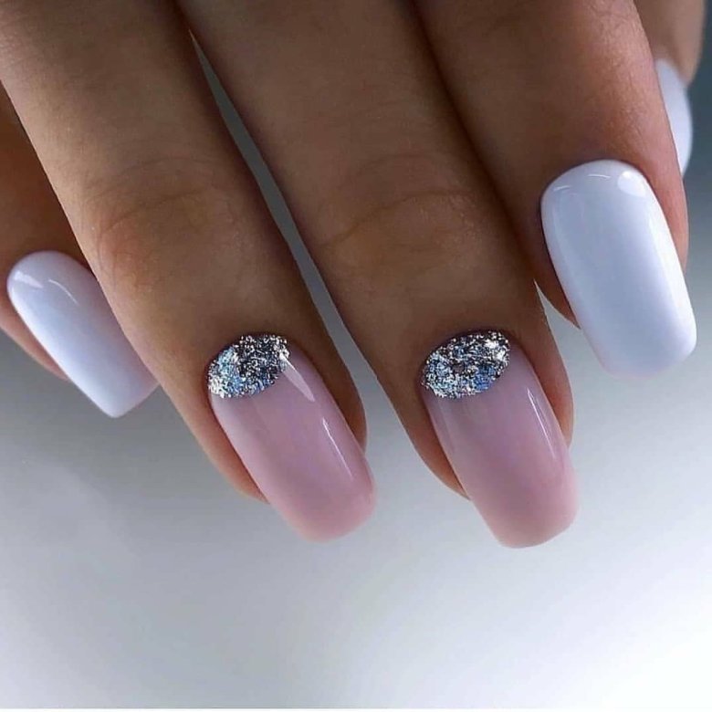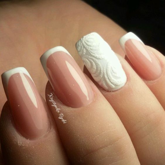 - френч-маникюр акцент: Используйте френч-маникюр на практически всех ногтях, но на выделенных пальцах измените классический френч-дизайн, например, сделав его двухцветным или добавив украшения.