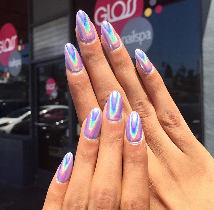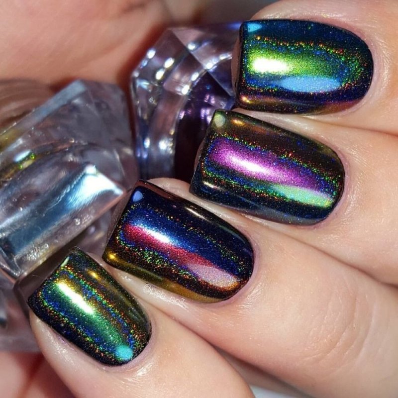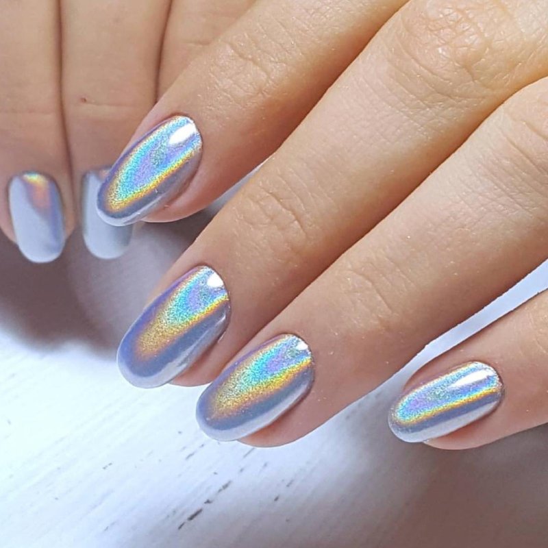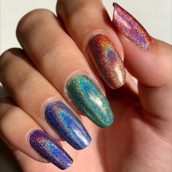 - лак: простой способ — нанести голографический лак на ногти. Такие лаки доступны в разных оттенках и плотности голографических частичек.