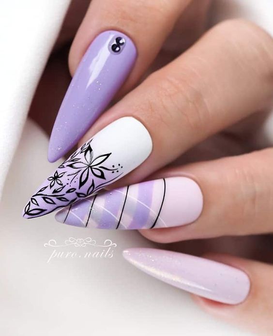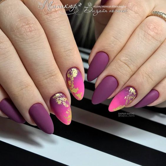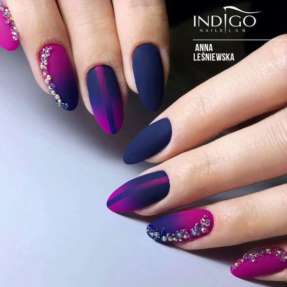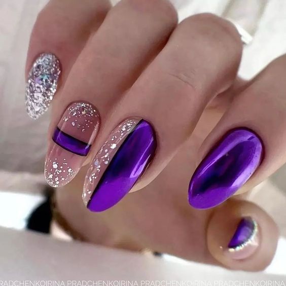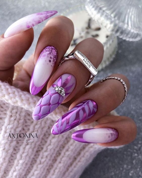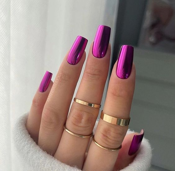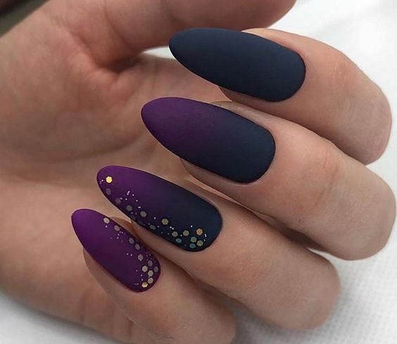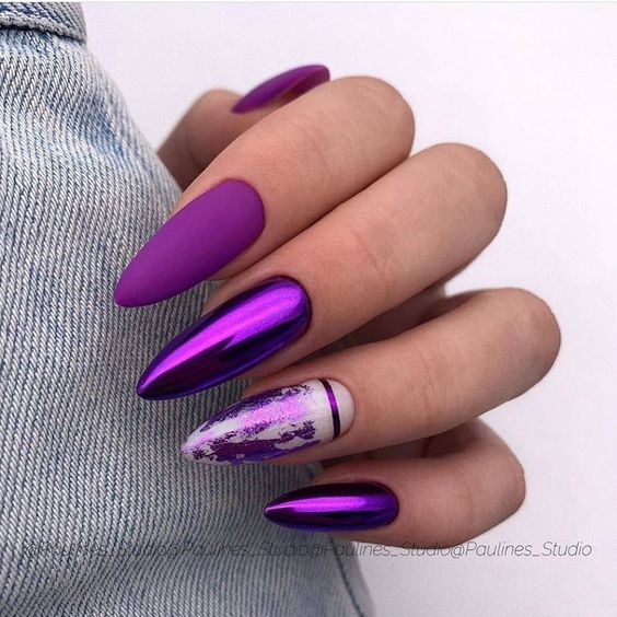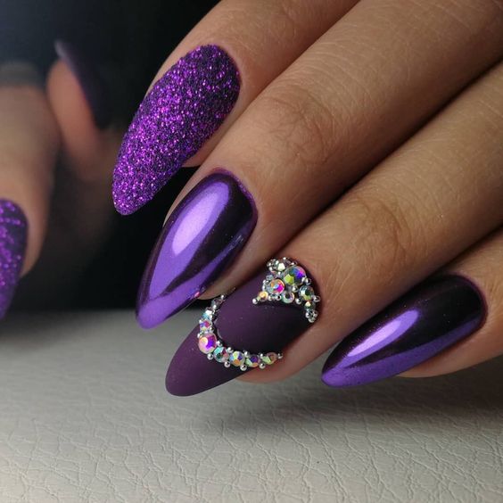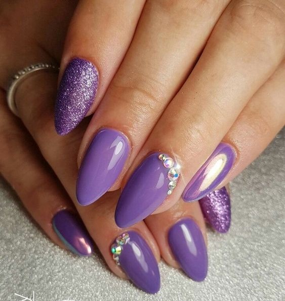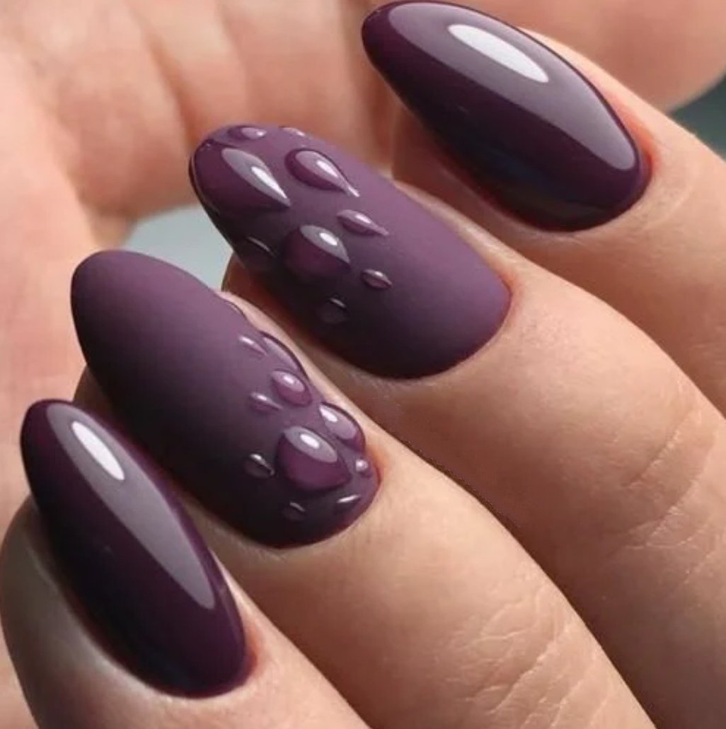 - темно-фиолетовый: этот оттенок придает ногтям загадочность и роскошь. Выберите глубокий, плотный фиолетовый или эффектно сочетающийся с лаком металлический оттенок;