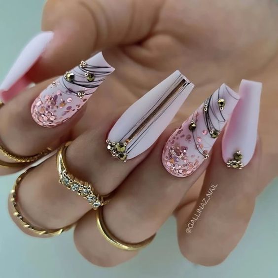 - узорный акцент: Нанесите на все ногти однотонный лак, а затем на выделенные пальцы нарисуйте узор или нанесите декоративные элементы, такие как стрипы, блестки или стразы.
