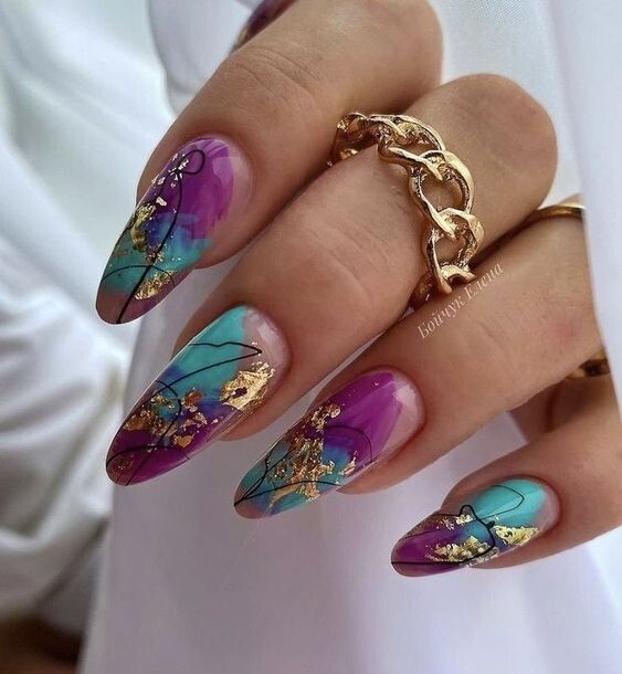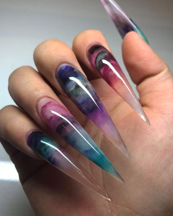 - водные маникюры. Эта техника включает погружение ногтей в специальные краски, создающие уникальный мраморный или акварельный эффект. После погружения ногтей в краску можно использовать зубные палочки или другие инструменты для создания желаемого принта.
