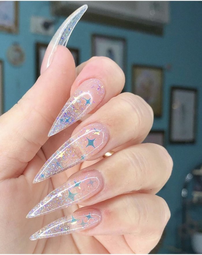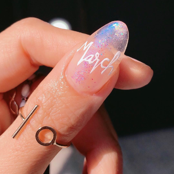 - крупные глиттерные частицы (песок): нанесите базовый лак на ногти и, пока он еще свежий, посыпьте его крупными глиттерными частицами. Подождите, пока лак полностью не высохнет, а затем удалите лишние частицы при помощи кисточки или ватного диска;