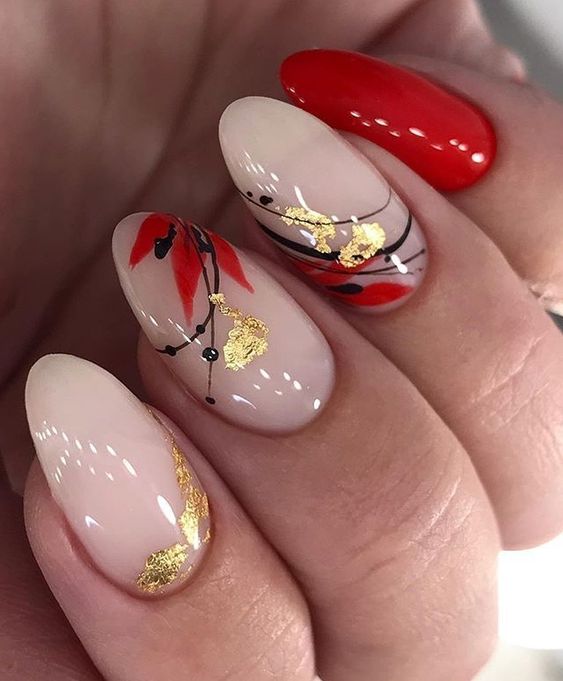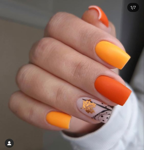 - цветовая палитра. Осень ассоциируется с тёплыми и насыщенными оттенками, такими как бордовый, оранжевый, темно-красный, коричневый, золотистый и медный. Эти цвета добавляют теплоту и уют в дизайн ногтей;