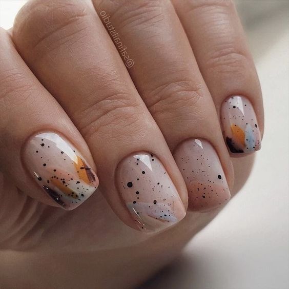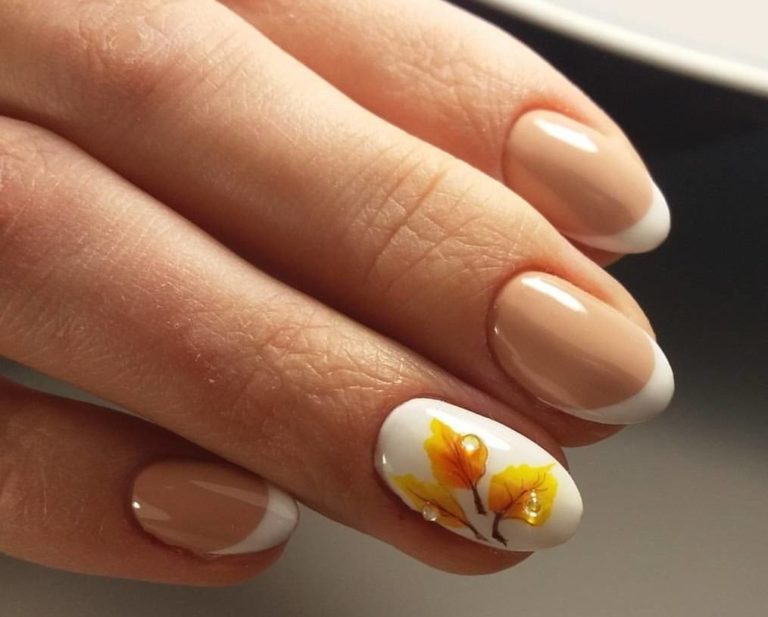 - осенний акцент. Добавьте осенний акцент на нюдовые ногти, используя стемпинг или ручную роспись. Это могут быть листья, живописные осенние пейзажи или грибы;