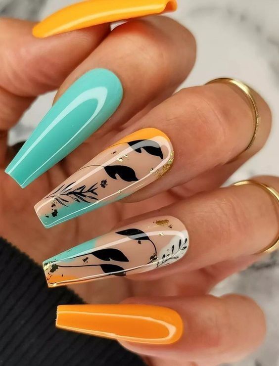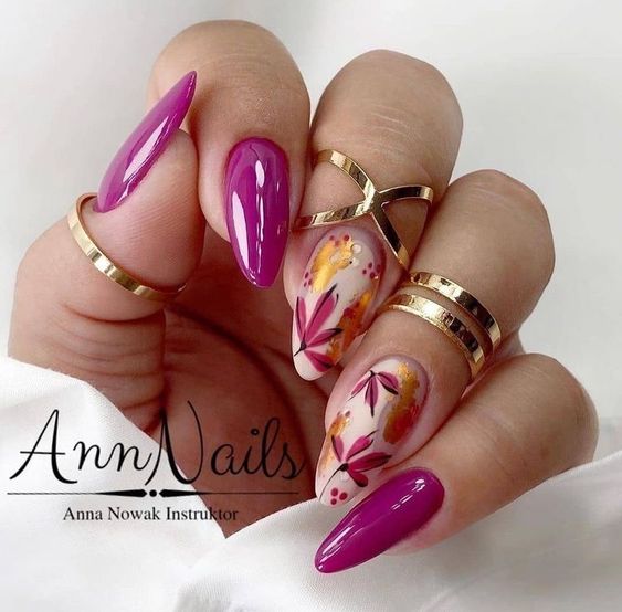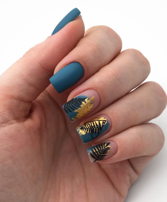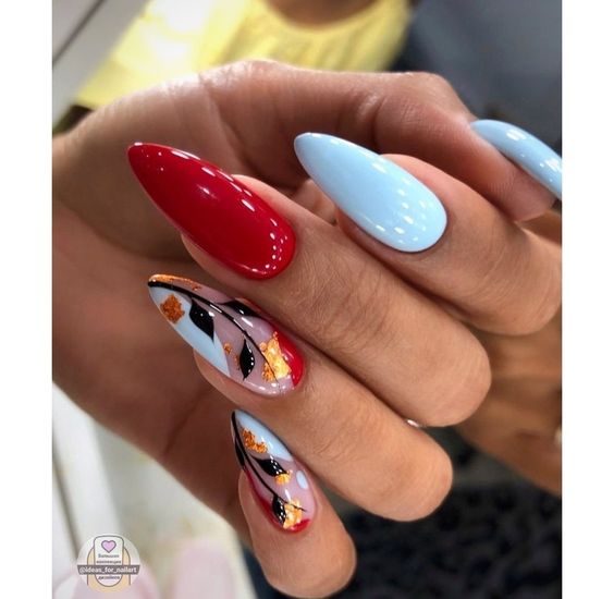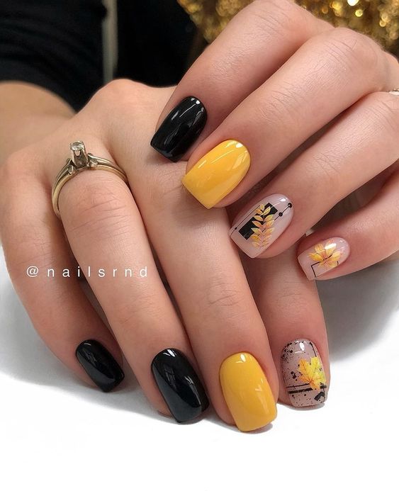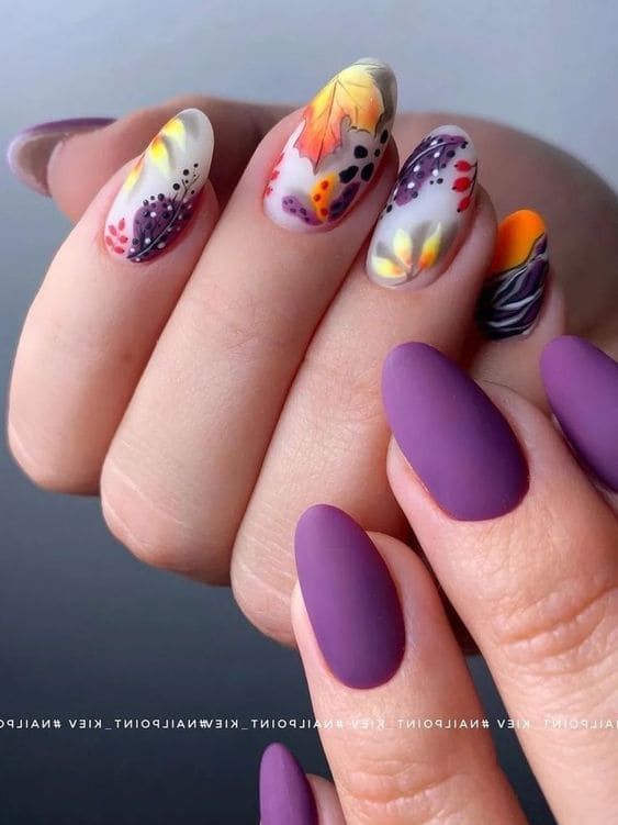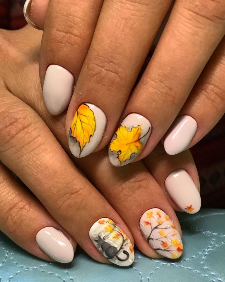 - комбинированные рисунки. Смешивайте различные осенние элементы на ногтях для создания уникальных и многослойных дизайнов;
