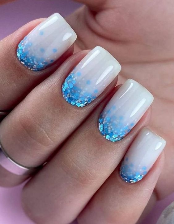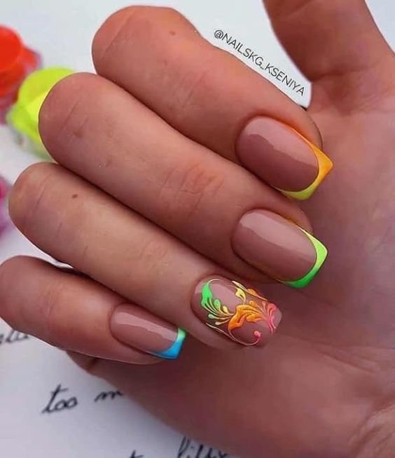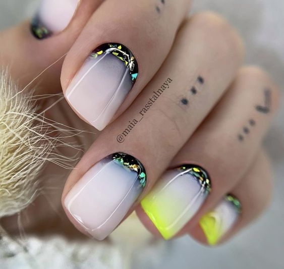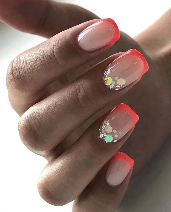 - градиентный френч. Создайте градиентный эффект на кончиках ногтей, начиная с насыщенного цвета в основе и плавно переходя к более светлому оттенку к кончикам. Это создаст интересный переход между цветами и придаст маникюру оригинальность;