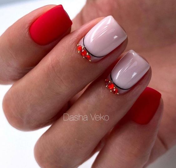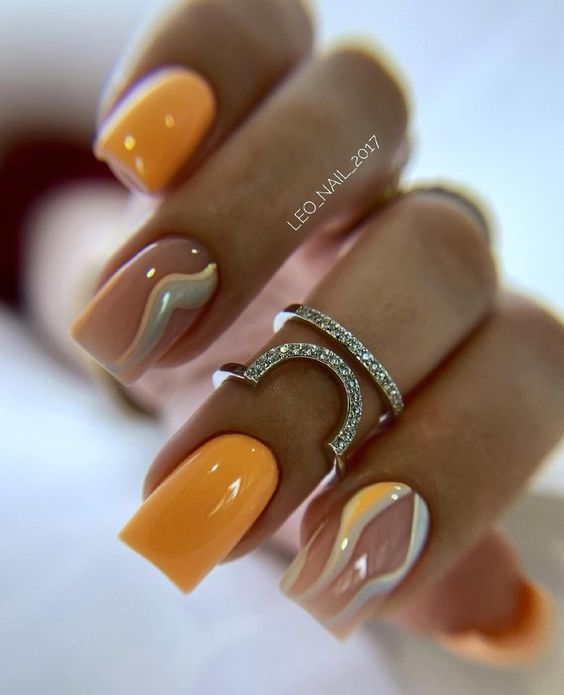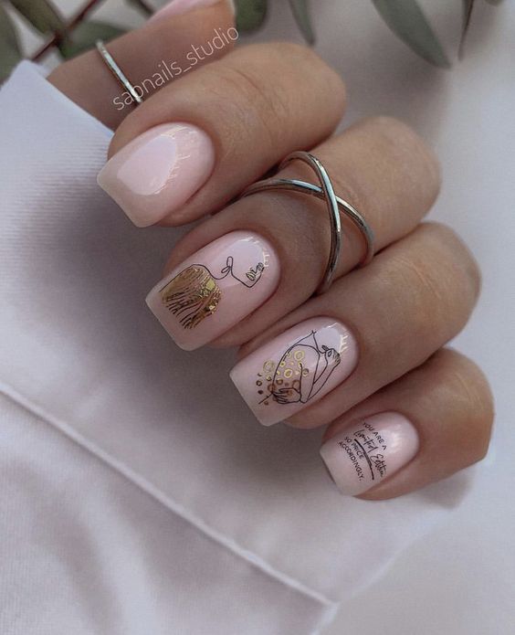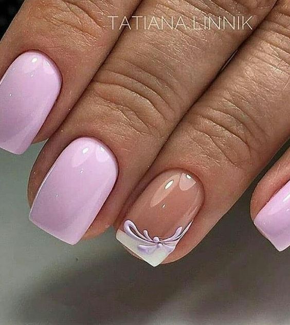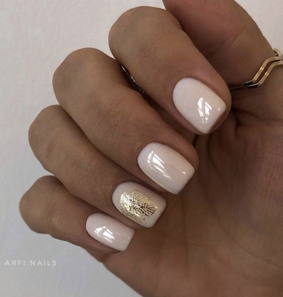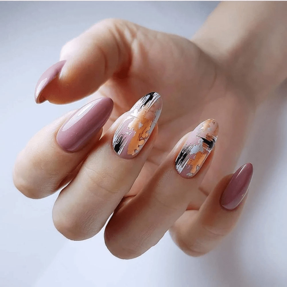 - нюдовый маникюр с акцентом. Покройте большинство ногтей нюдовым лаком и выберите один или несколько ногтей для создания акцентного дизайна. Это может быть акцентный цвет, нанесенный в виде полос, узоров или абстрактных элементов;
