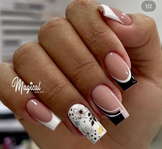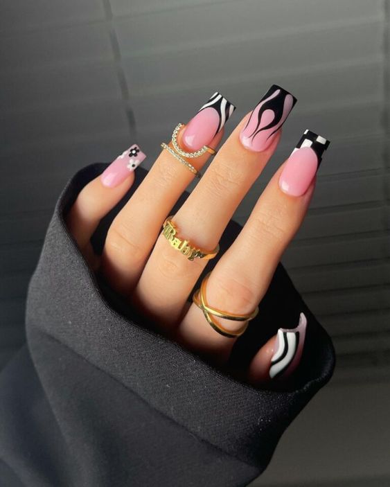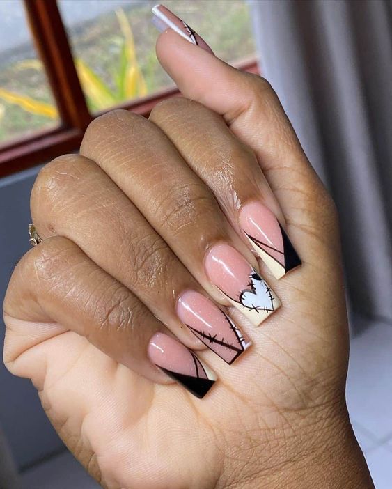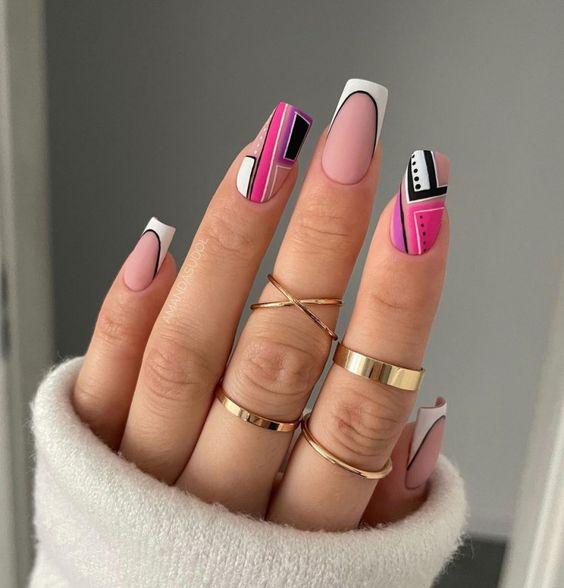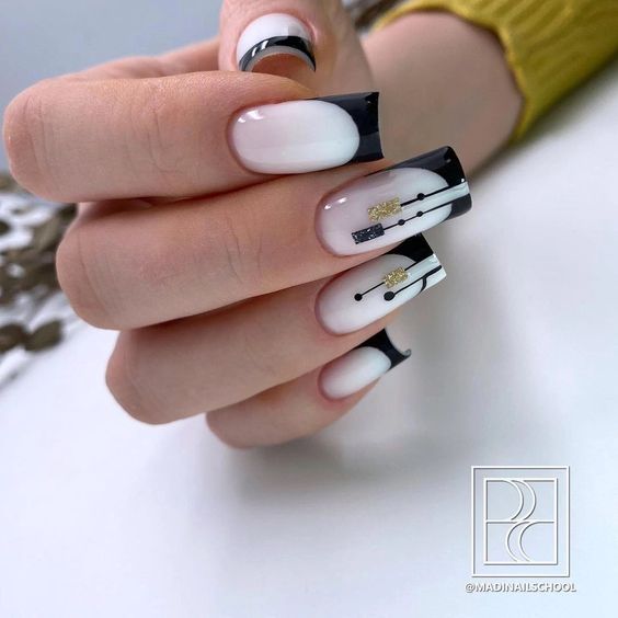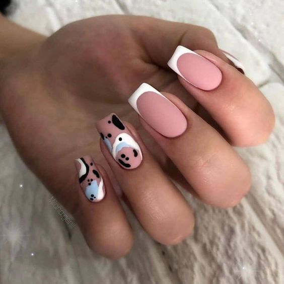 - абстрактный френч. Попробуйте экспериментировать с формой и расположением полоски на кончиках ногтей. Это может быть необычная форма, зигзаги или неровные линии, которые добавят интриги и индивидуальности маникюру;
