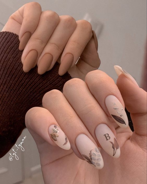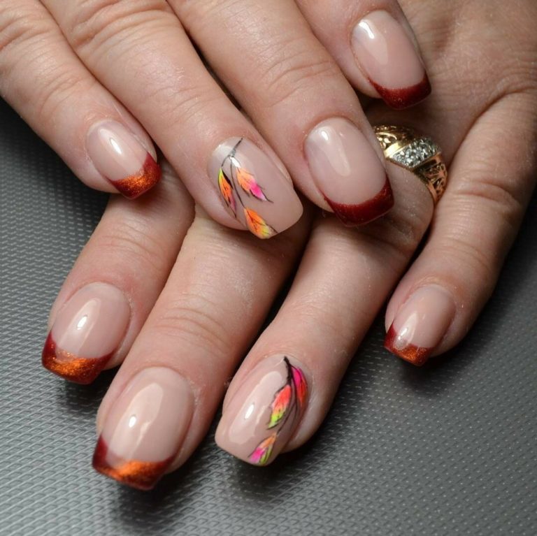 - листья и осенние мотивы. Добавьте на кончики ногтей небольшие рисунки листьев, ветвей или других осенних элементов. Это придаст маникюру тематический акцент;