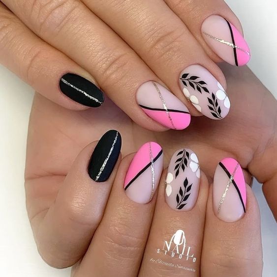 - акценты и узоры. Добавление декоративных элементов, таких как стразы, стеклярус, глиттер, гравировка и стемпинг, помогает придать маникюру дополнительную глубину и индивидуальность;