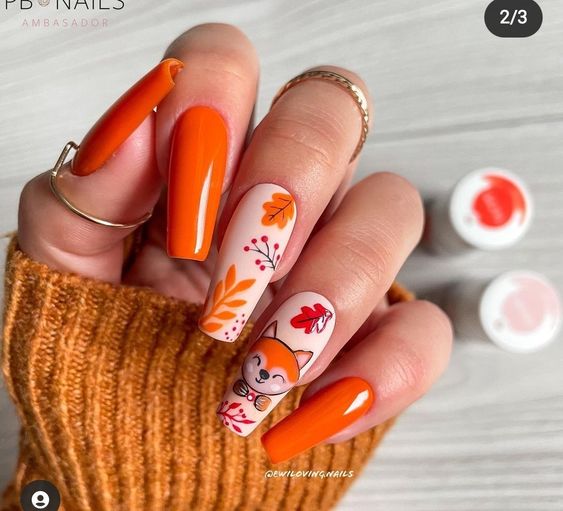 - природные мотивы. Осенний маникюр в октябре часто вдохновлен природными элементами, такими как листья, желуди, тыквы, ягоды, грибы и павлиньи перья. Эти мотивы могут быть изображены на ногтях с помощью рисунков, стемпинга или наклеек;