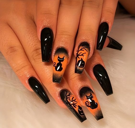 - черные кошки. Нарисуйте на ногтях силуэты черных кошек или их милые мордочки. Это символы Хэллоуина и волшебства;