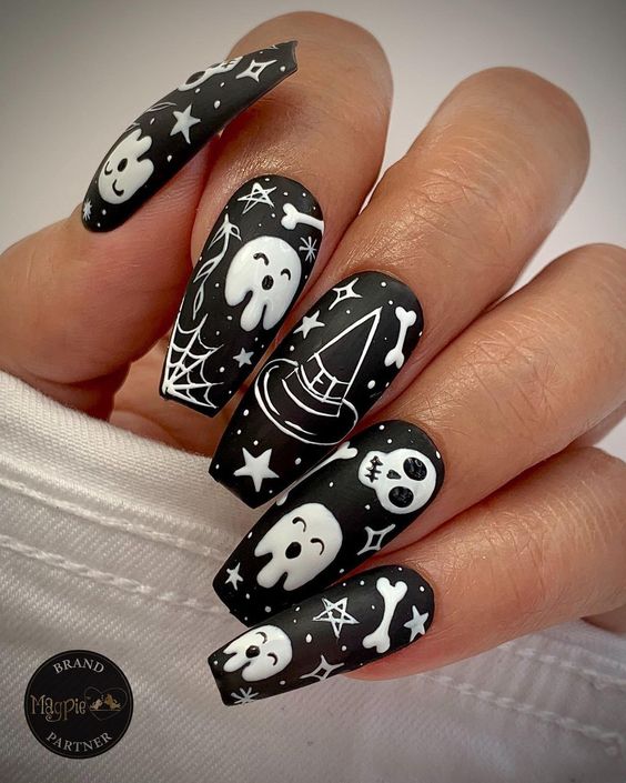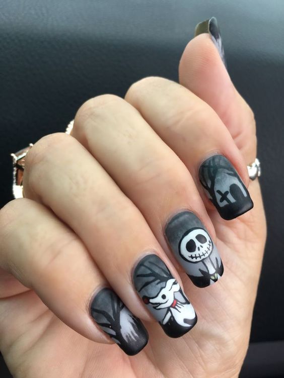 - черепа и кости. Нарисуйте на ногтях милые или страшные черепа и кости с использованием белого и черного лака. Вы можете добавить детали, такие как банты, цветы или паутину;