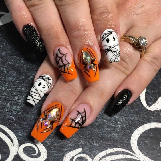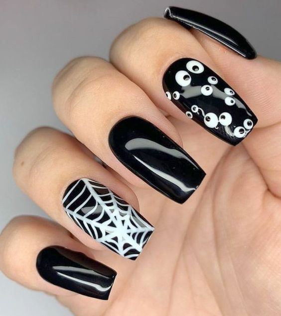 - пауки. Нарисуйте милых или забавных пауков на ногтях, добавив им глазки и усы;