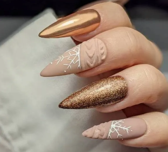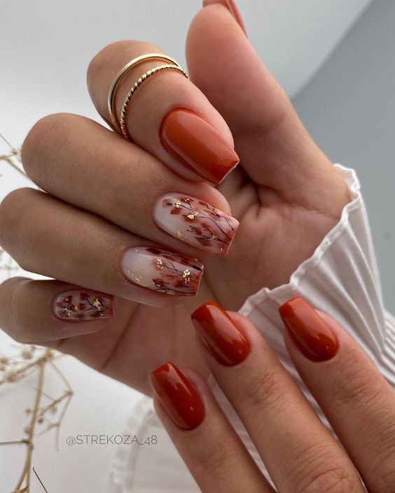 - золотистый или медный: эти металлические оттенки добавят блеск и роскошь вашему маникюру, напоминая о золотой осени.