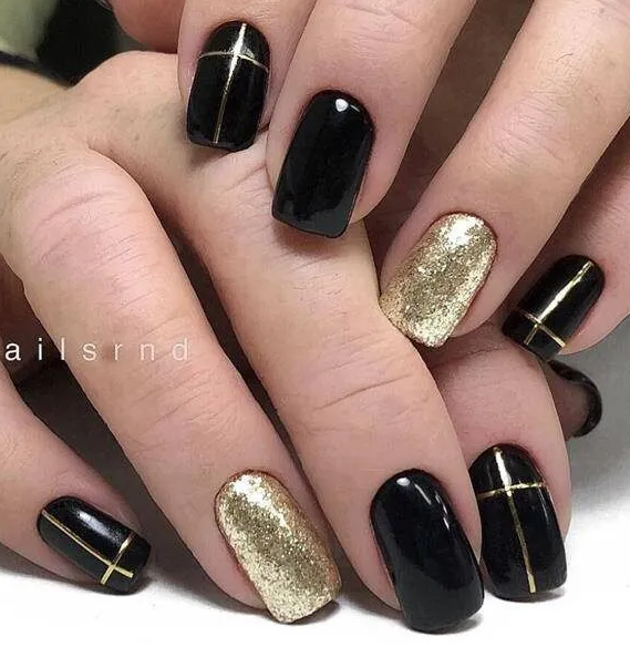 - металлическая полоска. Добавьте металлическую полоску вдоль обычной белой или другой светлой полоски на кончиках ногтей. Это придаст маникюру изысканность и блеск;