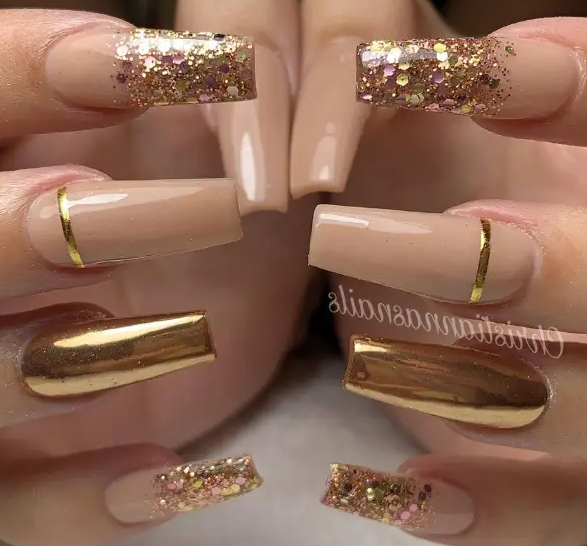 Популярные металлические цвета включают золото, серебро, бронзу, медь и платину. Эти оттенки могут быть использованы как основа для маникюра или как акцентные элементы. Металлические лаки могут быть однотонными или иметь текстурные вариации, такие как металлический глянец, матовый металлик или металлический глиттер.