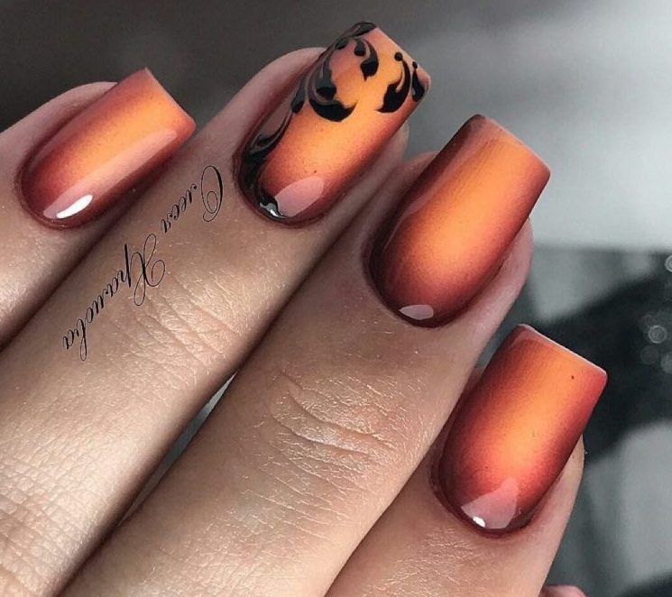 - подчеркнутая текстура. Применяйте различные оттенки лаков для создания градиента или текстурного эффекта, который будет визуально напоминать осенние поверхности.