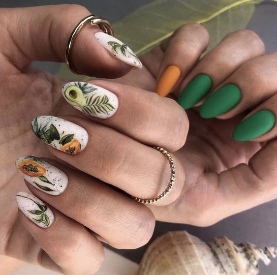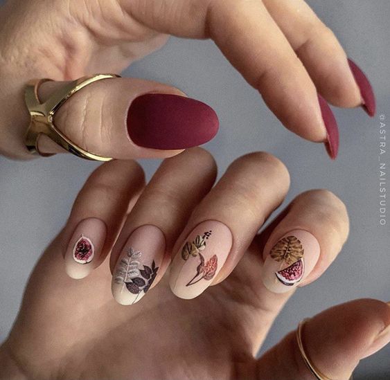 - фрукты. Рисунки яблок, груш, гранатов или других осенних фруктов могут придать маникюру яркий и вкусный вид;