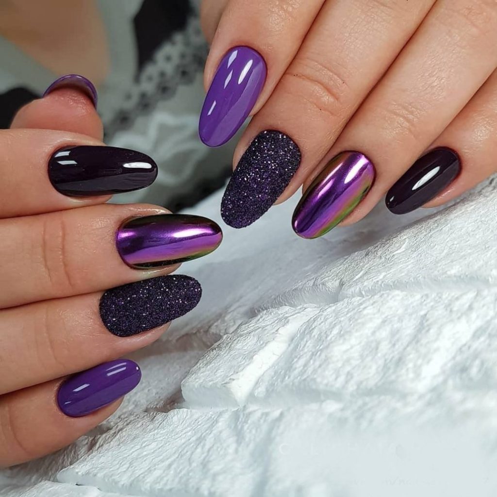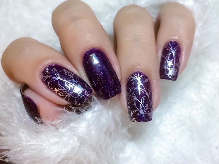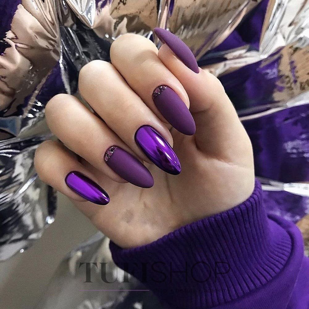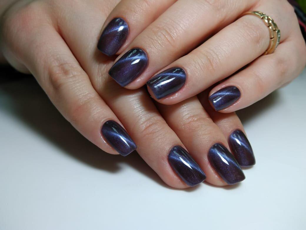 Глубокий фиолетовый актуален в январе как никогда. Часто этот оттенок сложно уместить в образ летом, осенью или весной. В эти сезоны более актуальными считаются более светлые тона палитры. А вот в январе вы можете сделать стильный фиолетовый маникюр с эффектом кошачьего глаза.