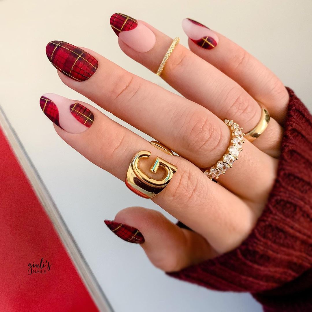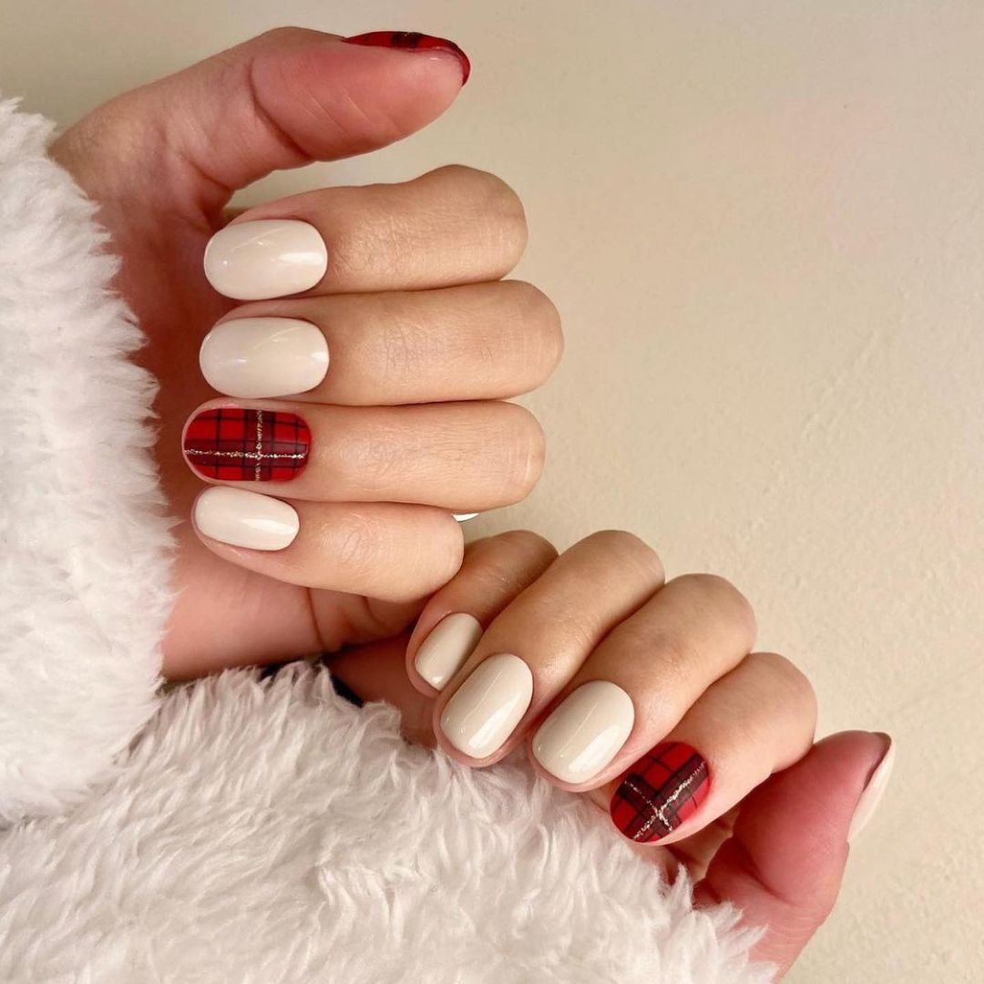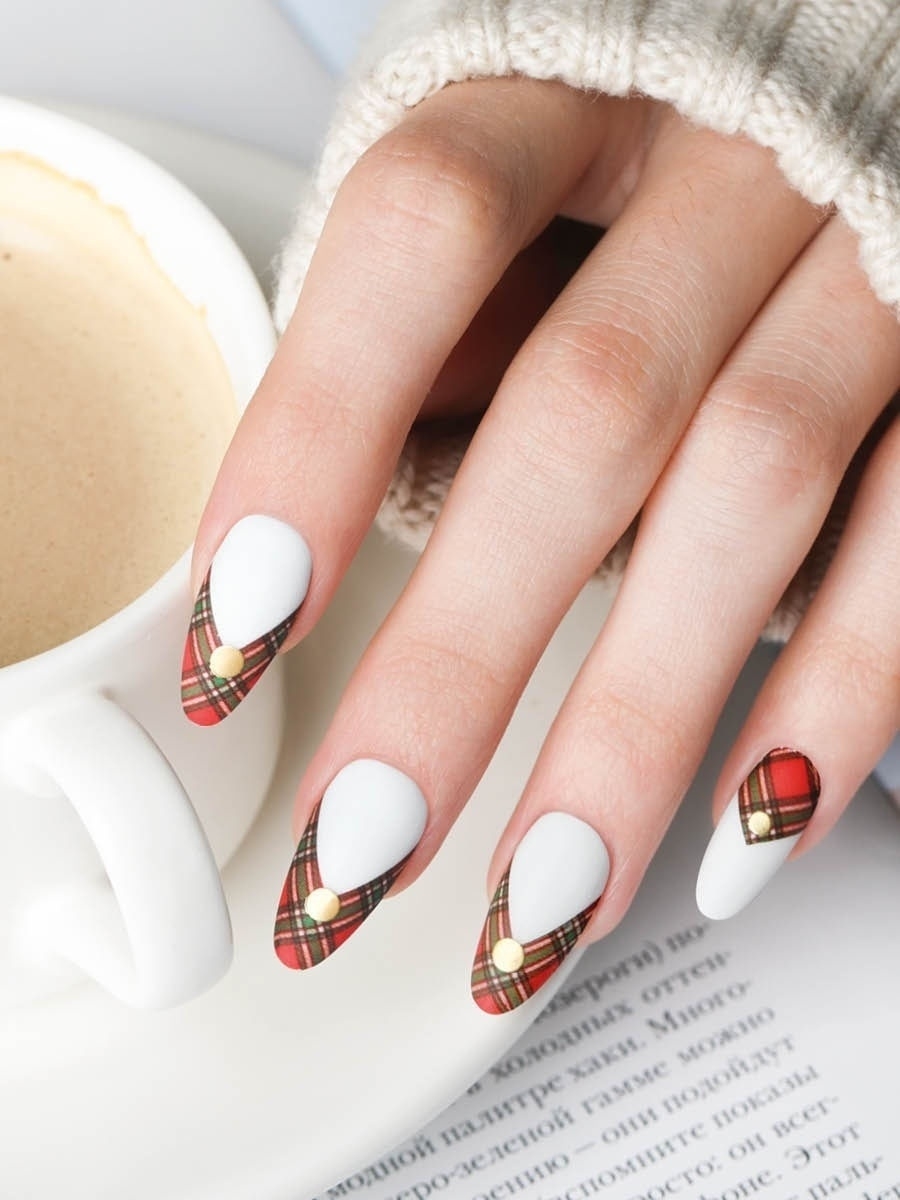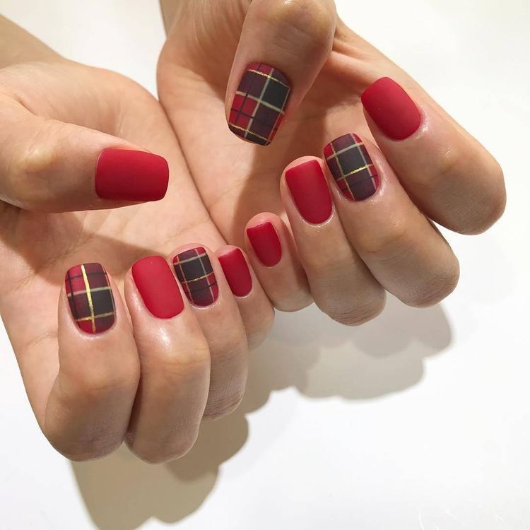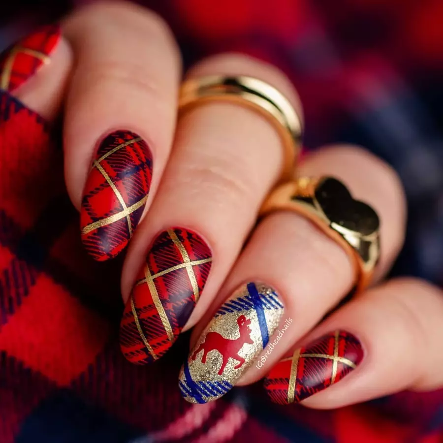 Еще один вариант утепления ноготков — одеть их в шотландку. Это теплая яркая ткань, ставшая символом уюта и защиты от холода. Изначально она производилась из 100 % шерсти. Клетчатые ноготки соответствующей расцветки — отличный маникюр для январских морозов. Дизайн выглядит необычно, стильно и уютно. Его можно сочетать с рисунками оленей, блестками и сделать матовым. В одежде такой дизайн эффектно смотрится с джинсами и теплыми толстыми свитерами.
