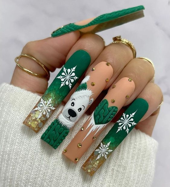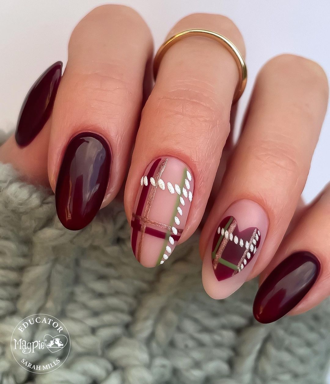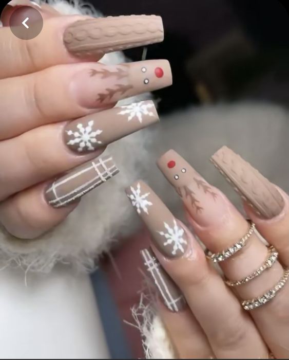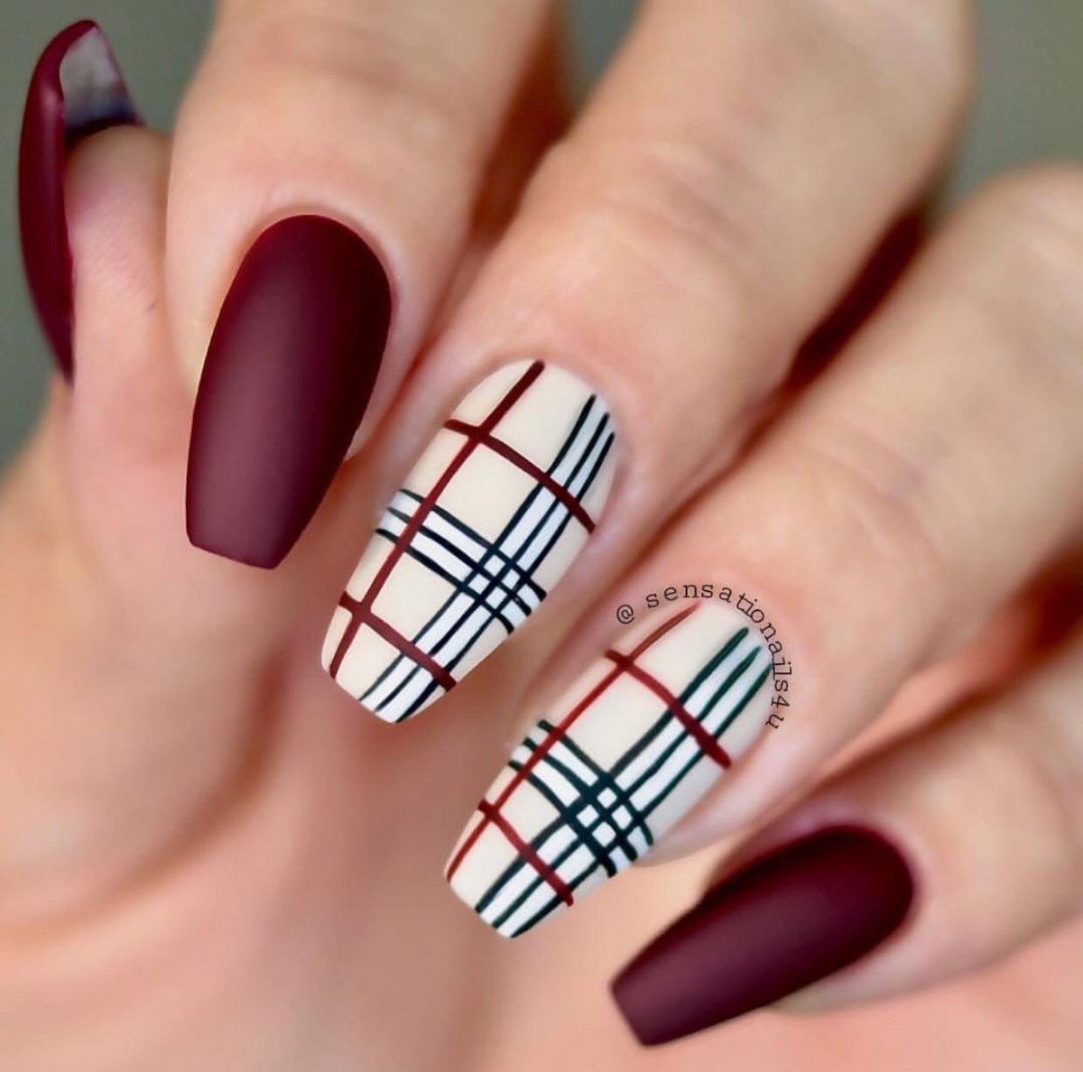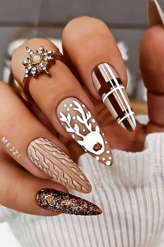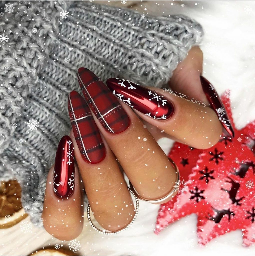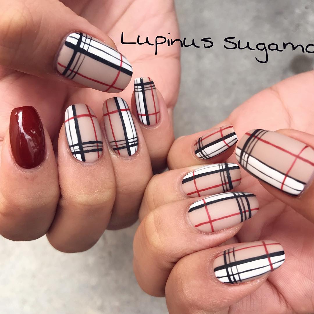 Еще один вариант утепления ноготков — одеть их в шотландку. Это теплая яркая ткань, ставшая символом уюта и защиты от холода. Изначально она производилась из 100 % шерсти. Клетчатые ноготки соответствующей расцветки — отличный маникюр для январских морозов. Дизайн выглядит необычно, стильно и уютно. Его можно сочетать с рисунками оленей, блестками и сделать матовым. В одежде такой дизайн эффектно смотрится с джинсами и теплыми толстыми свитерами.